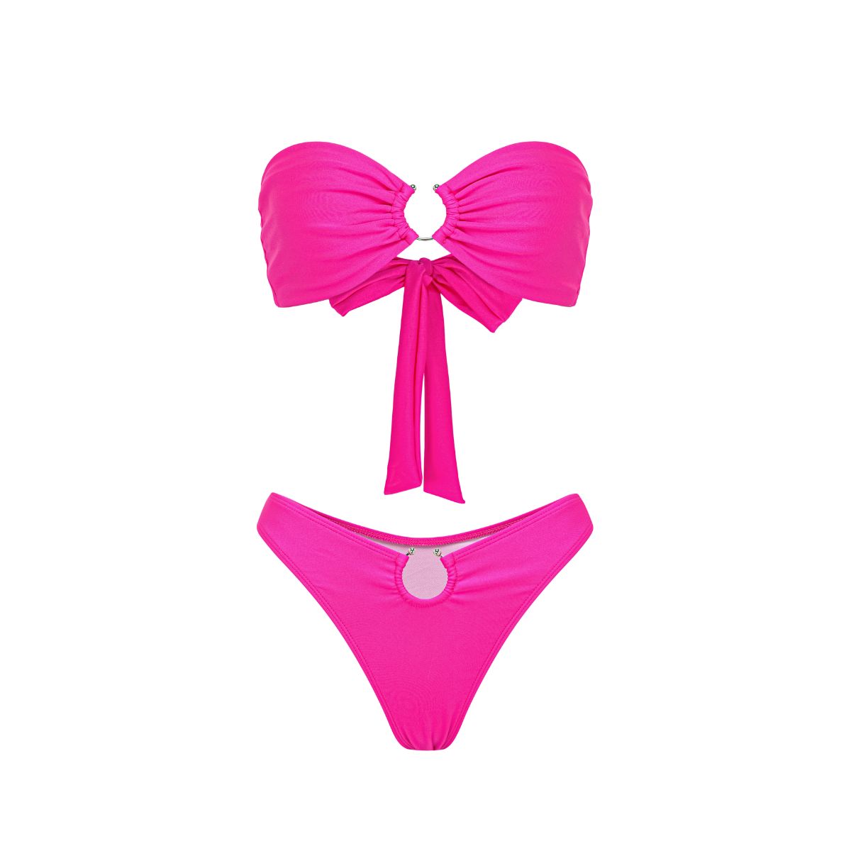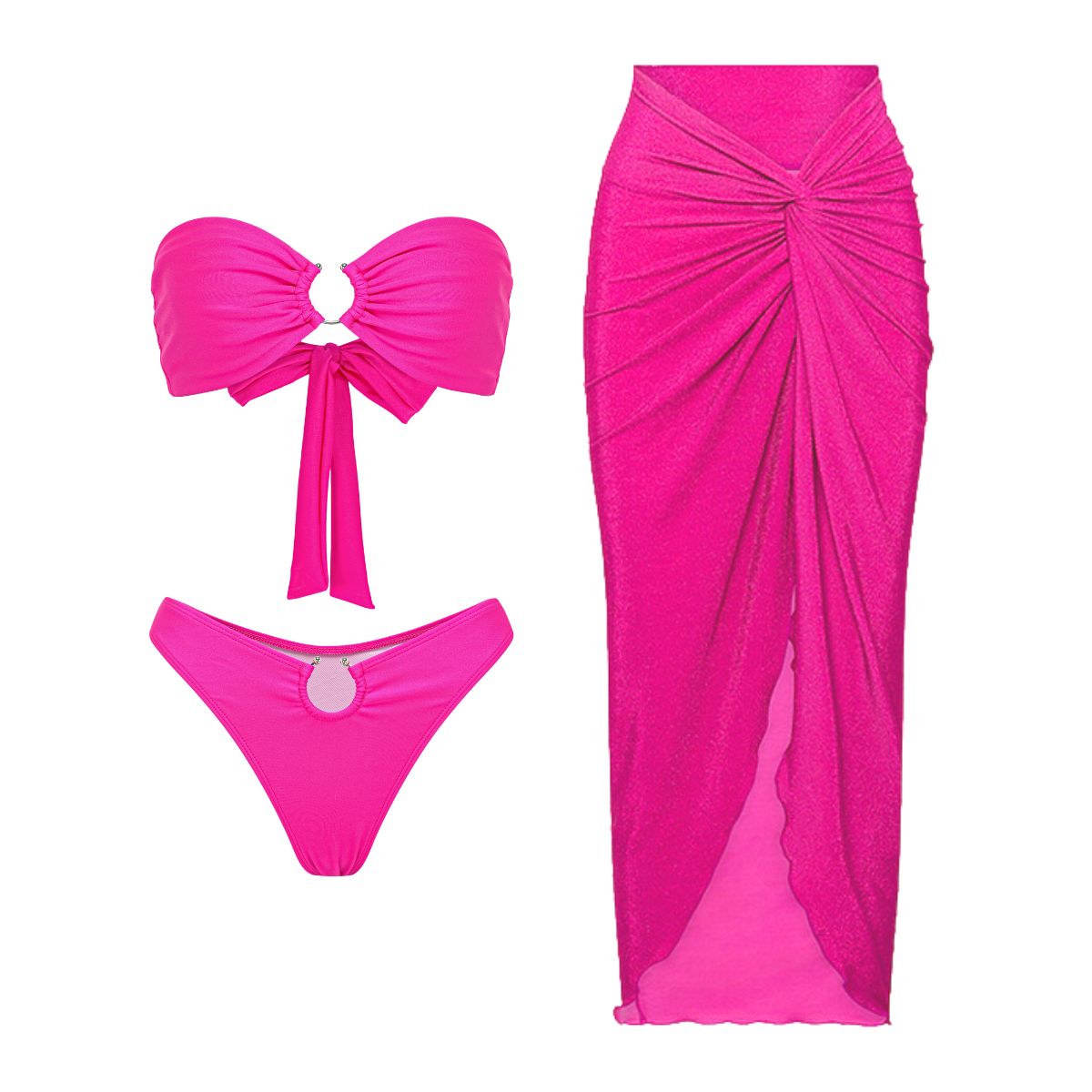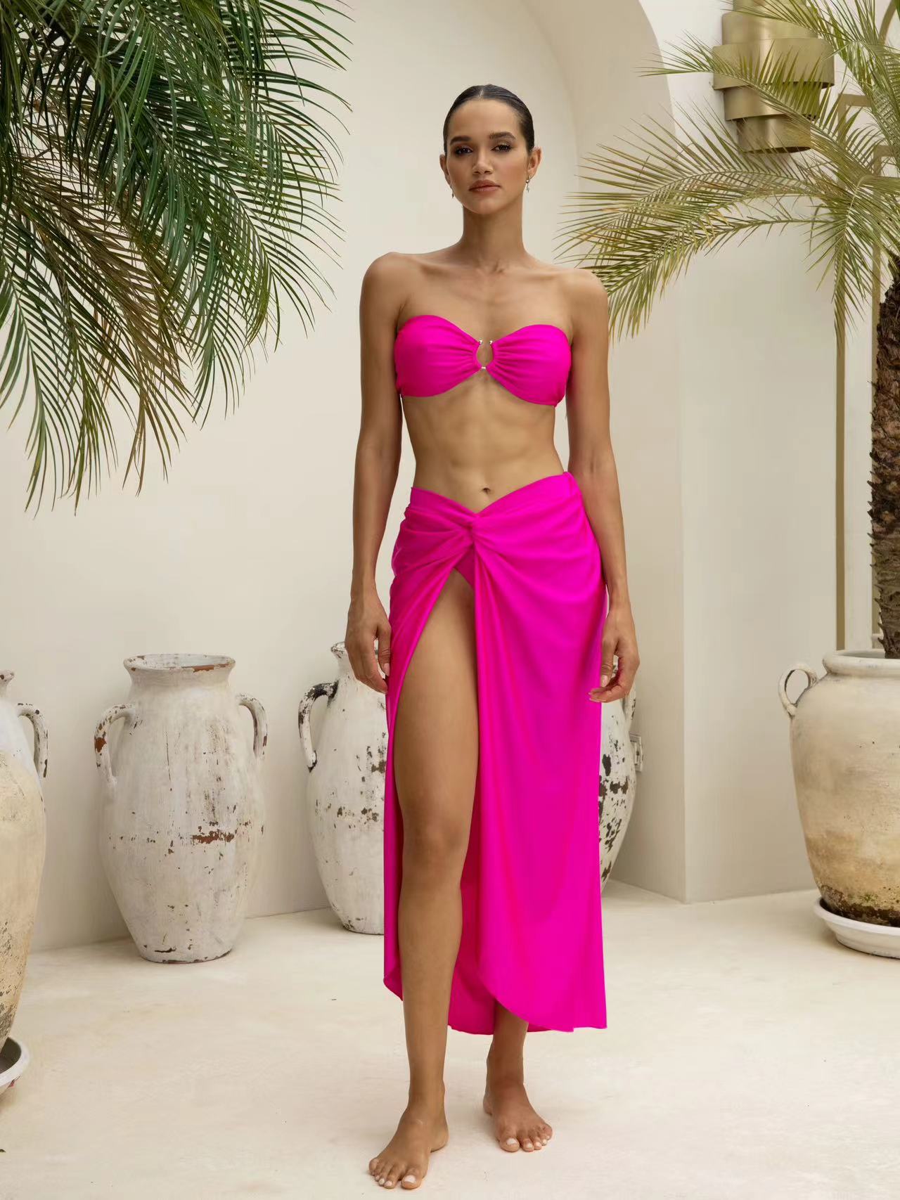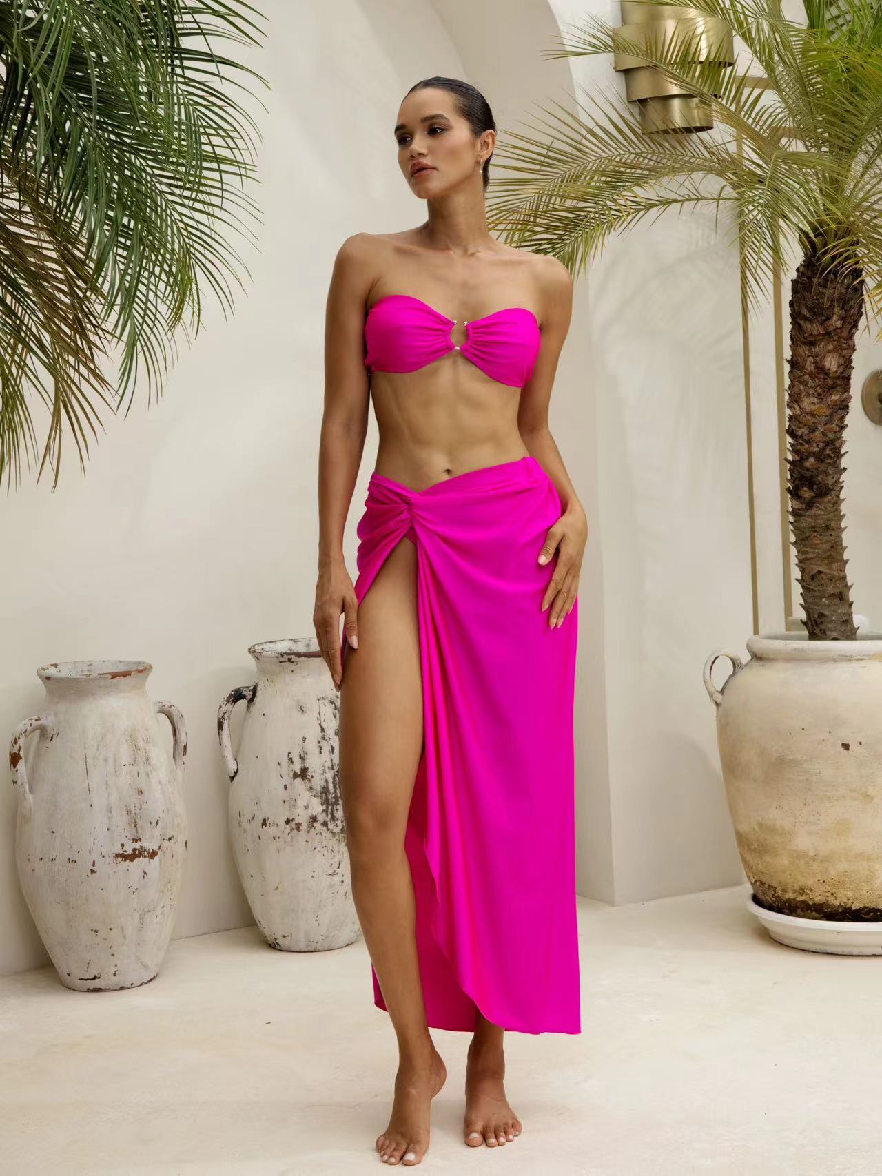 Bandeau Solid color Lace up Bikini Swimsuit and Sarong