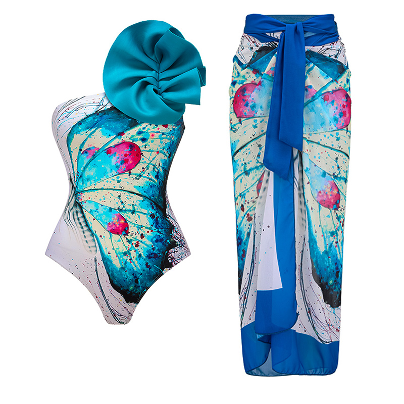 Bandeau Ruffled Orchid Print One Piece Swimsuit and Skirt