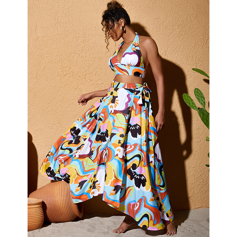 Lemon Print Tie-shoulder One Piece Swimsuit and Sarong or Skirt Flaxmaker