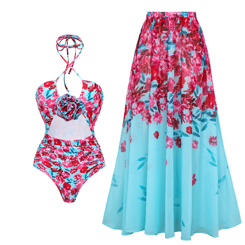 V Neck Solid Color Laser Cutting Flower One Piece Swimsuit and Skirt