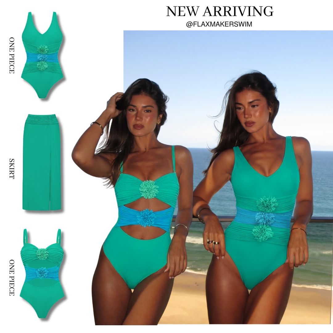 V Neck Solid Color Laser Cutting Flower One Piece Swimsuit and Skirt