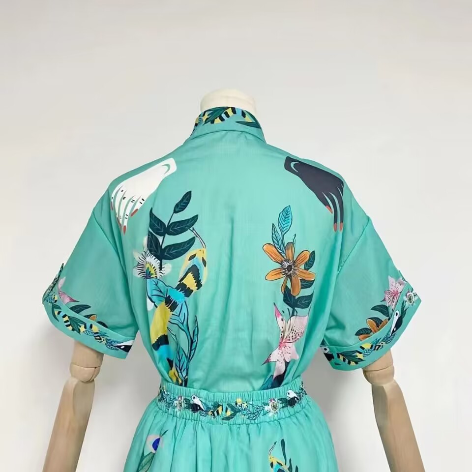 Long-sleeved Retro Green Grapes Print One Piece Swimsuit and Skirt