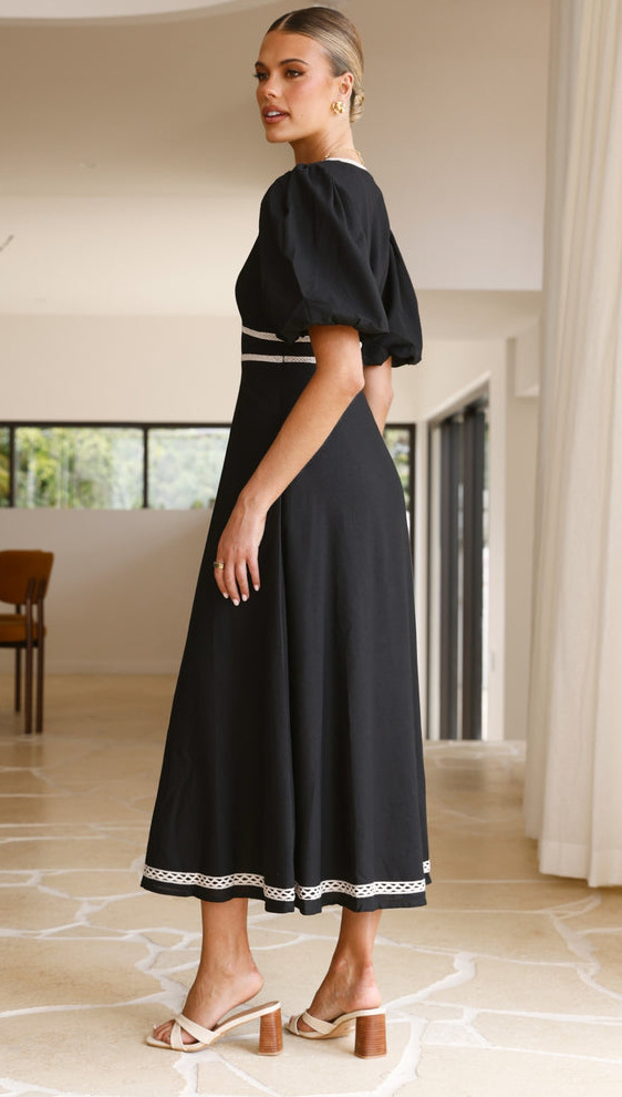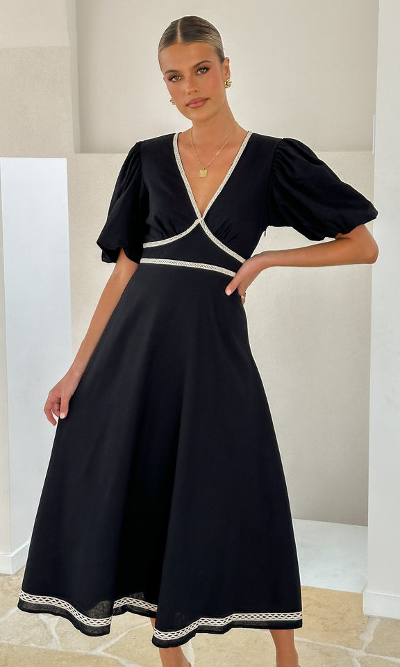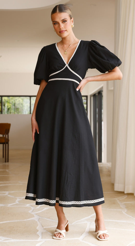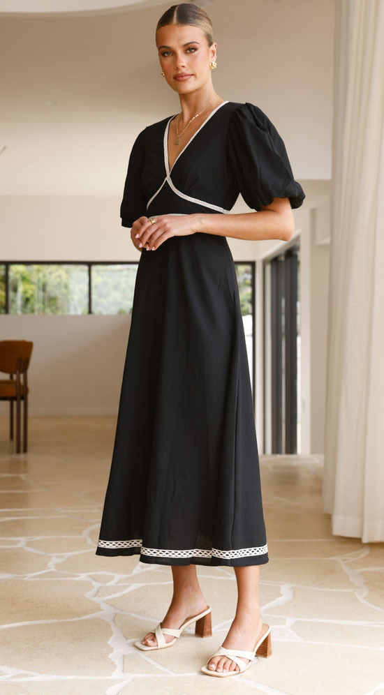 V Neck Puff Sleeve Midi Dress