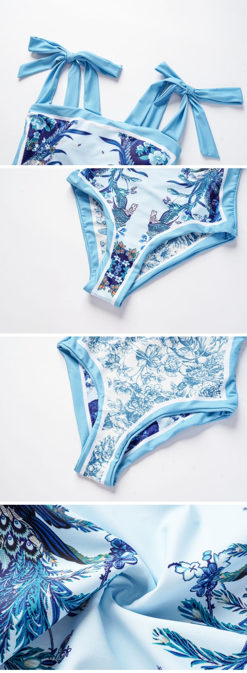 Flaxmaker Blue Reversible Bowknot Tie-shoulder One Piece Swimsuits and Sarong