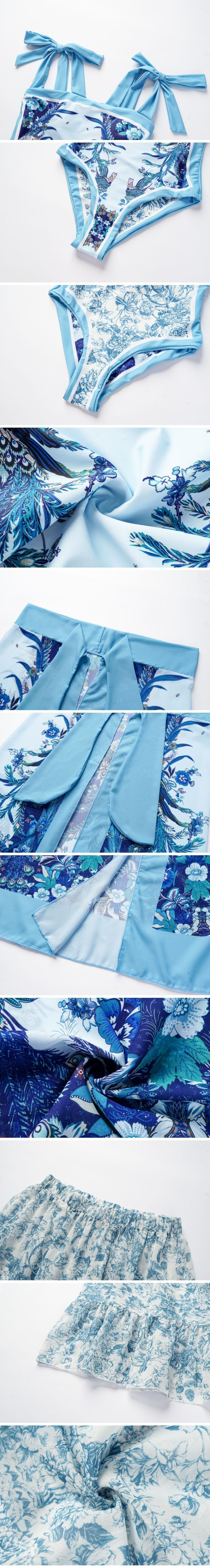Blue Reversible Bowknot Tie-shoulder One Piece Swimsuit and Sarong/Skirt Flaxmaker