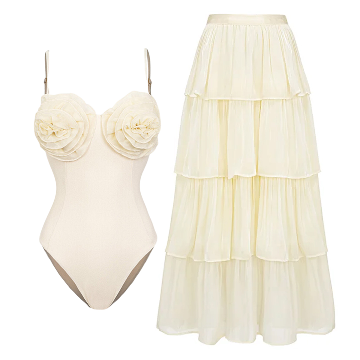 V Neck Solid Color Laser Cutting Flower One Piece Swimsuit and Skirt