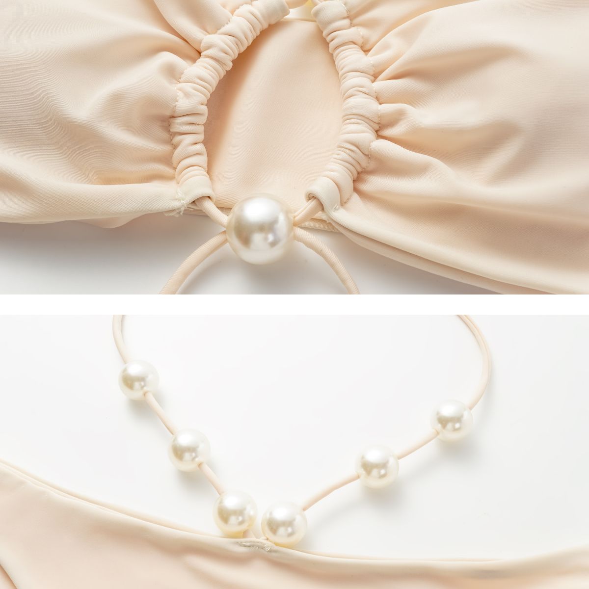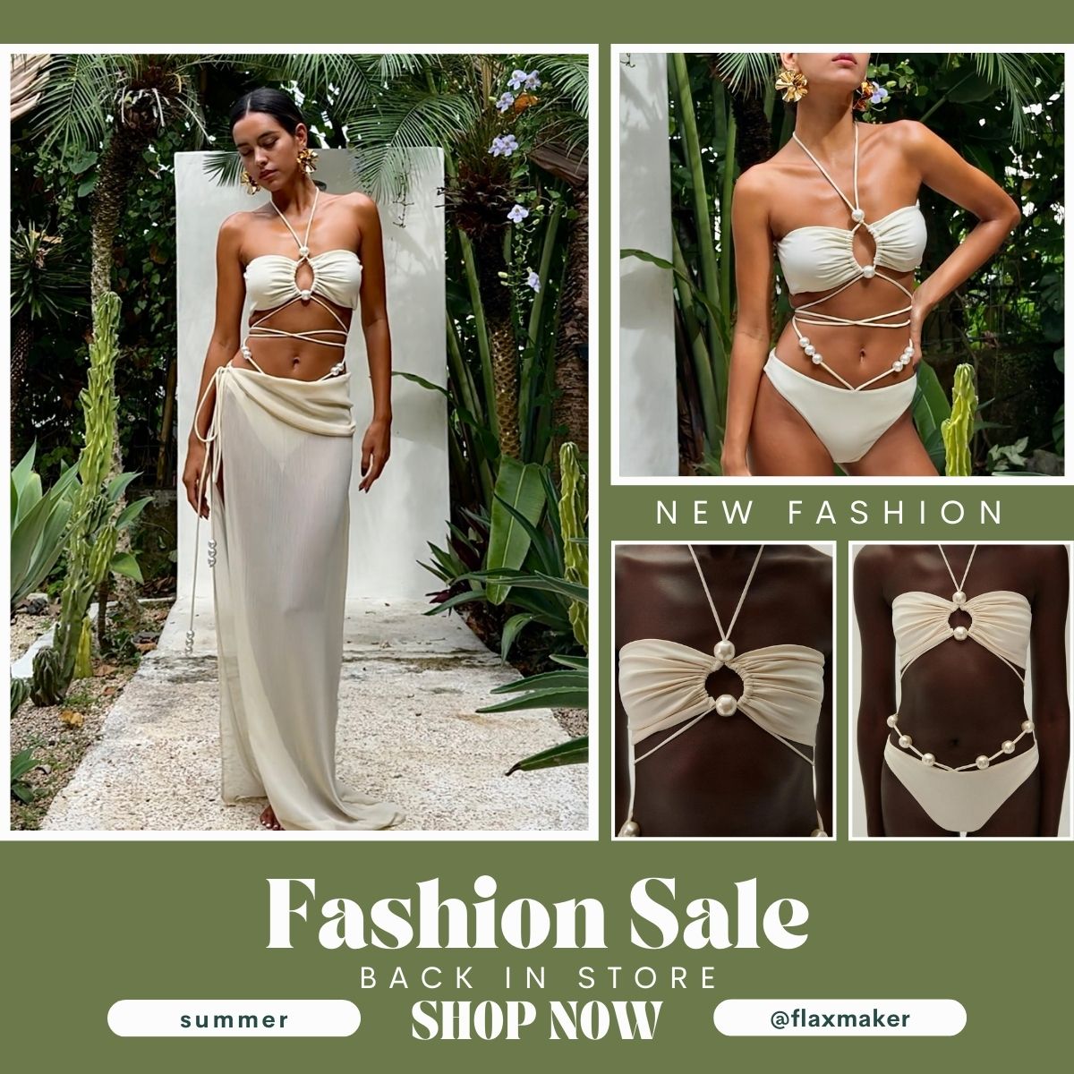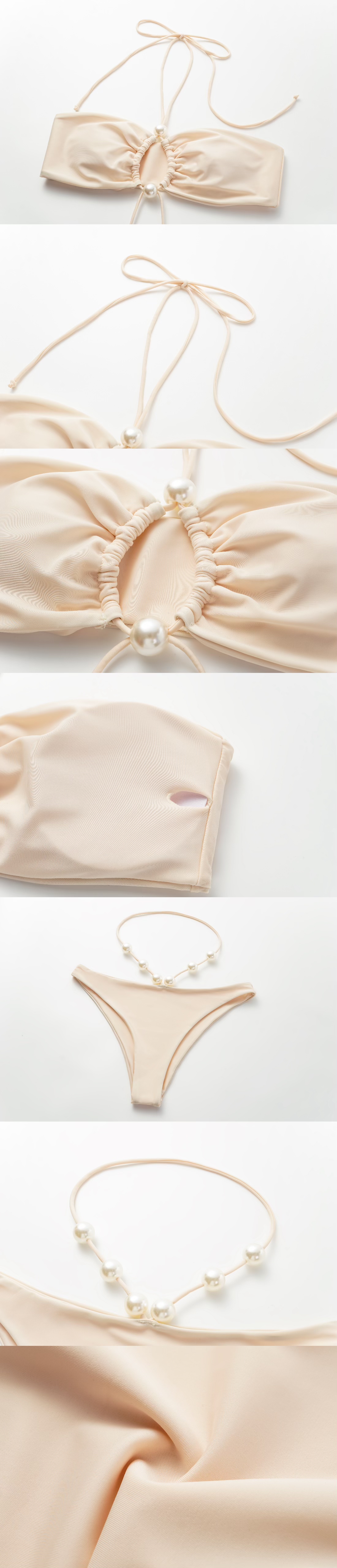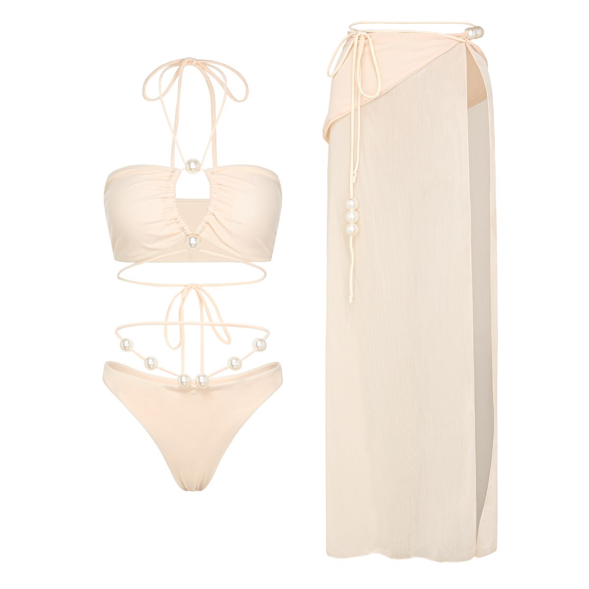 Pearl Detail Halter Lace Up Bikini Swimsuit and Sarong Flaxmaker