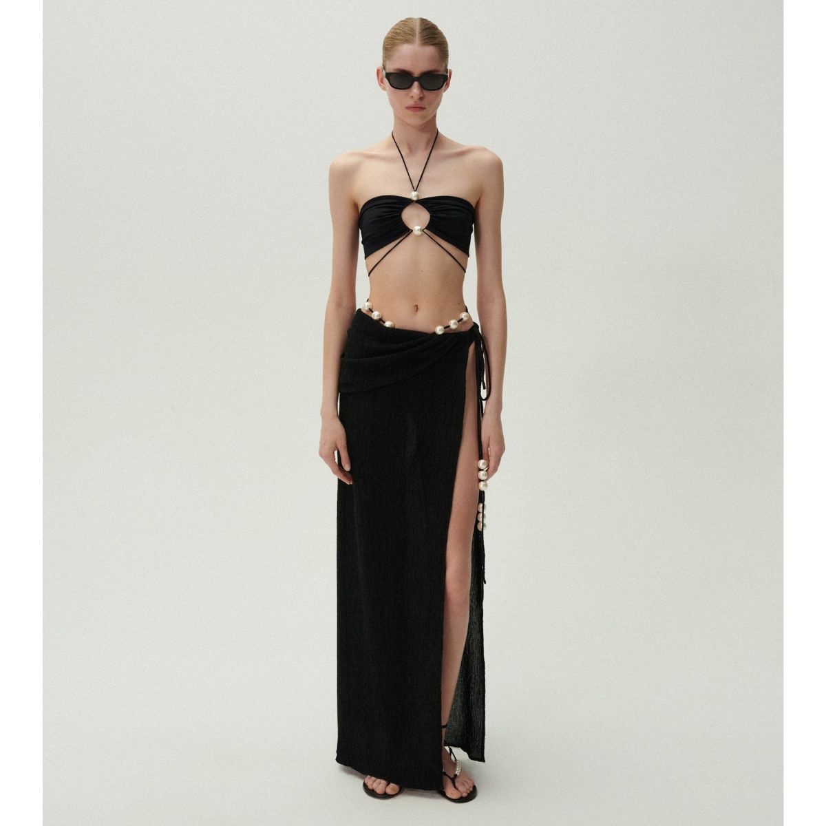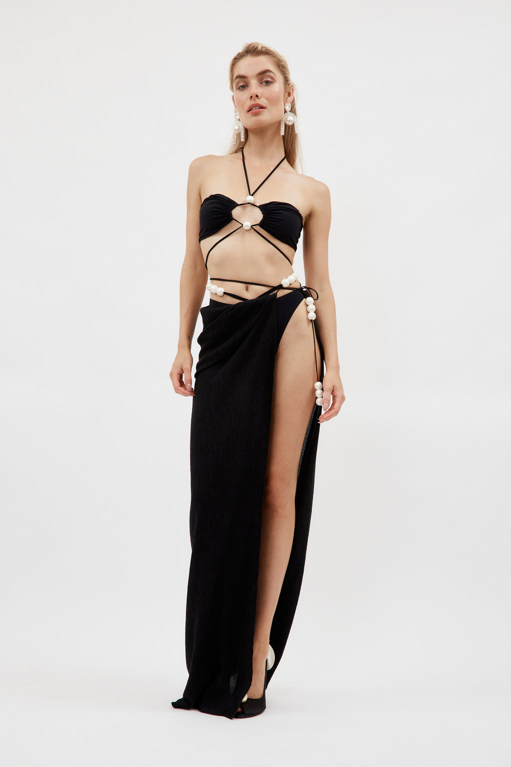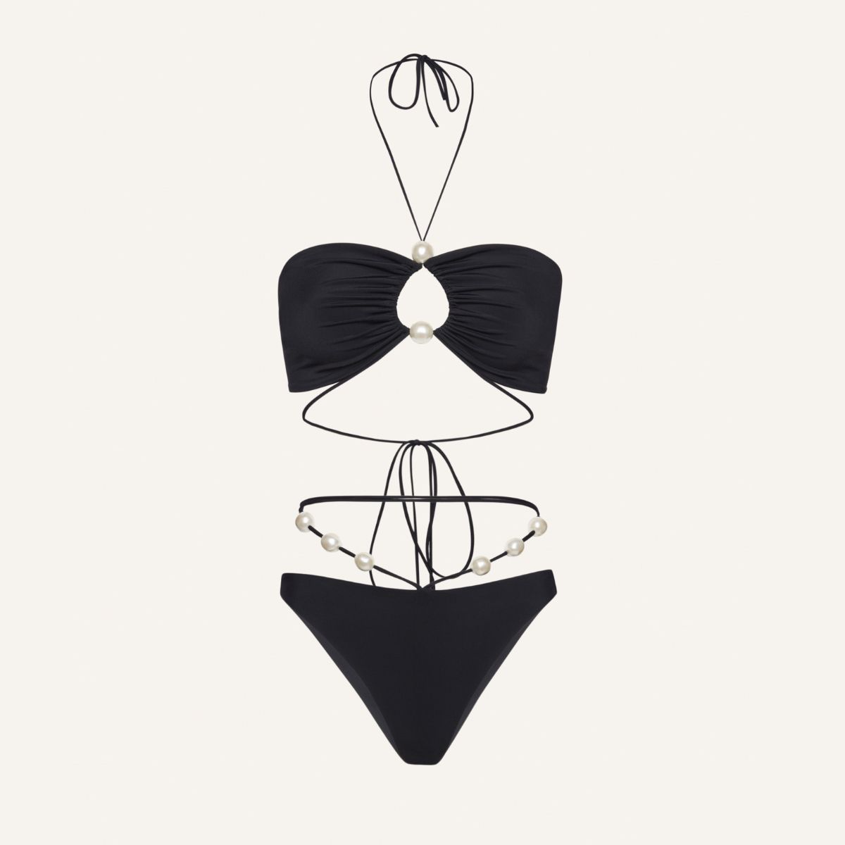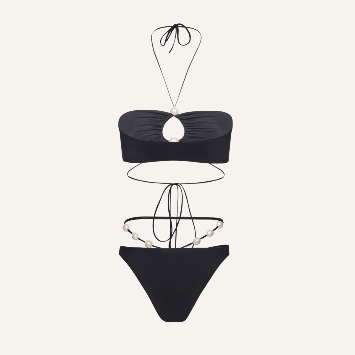 Pearl Detail Halter Lace Up Sexy Bikini Swimsuit and Sarong Flaxmaker