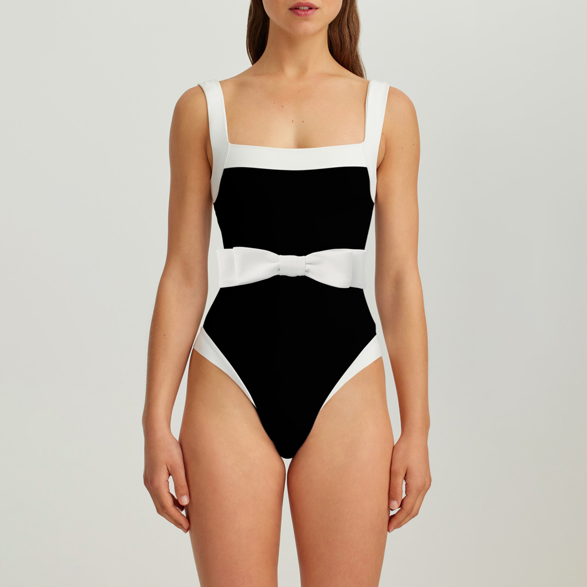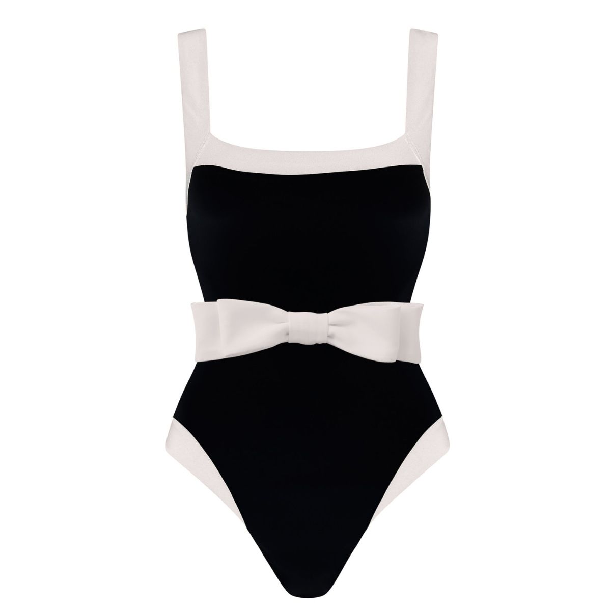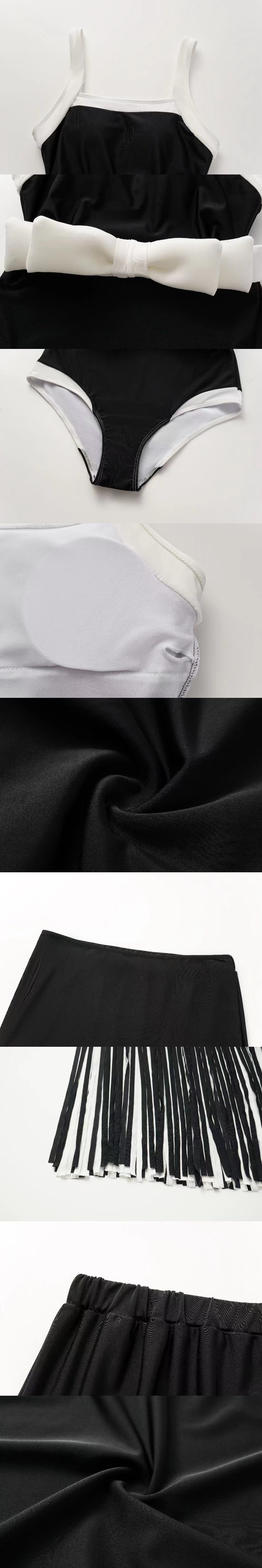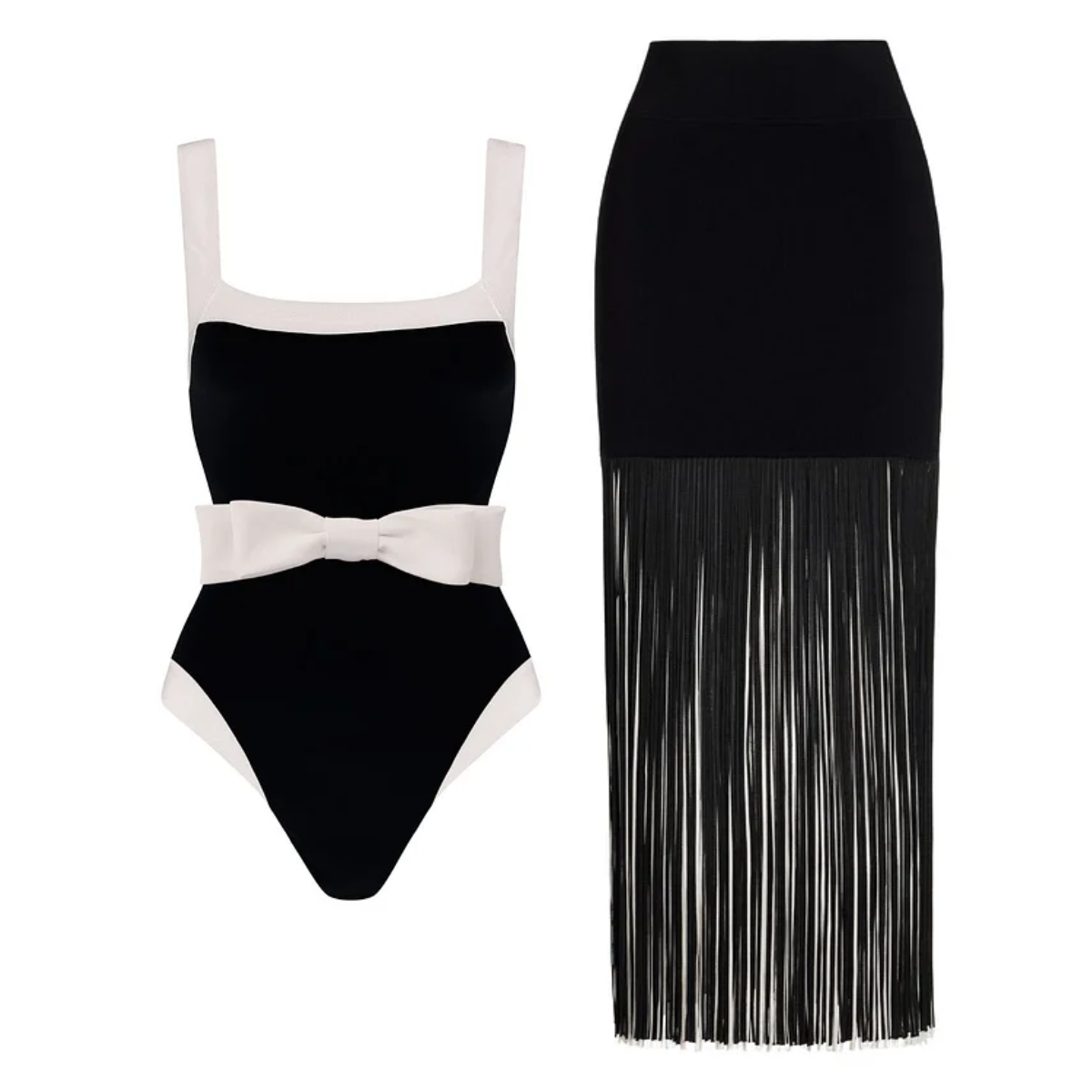 Bow Belted Black and White One Piece Swimsuit and Tassel Skirt