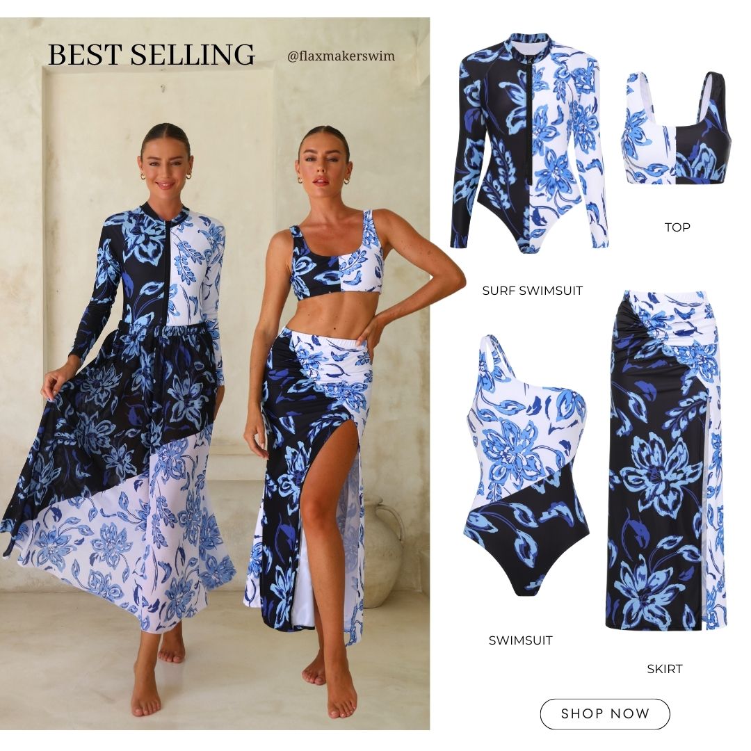 Long-Sleeved Classic Majolica Series Pattern Print One Piece Swimsuit and Skirt or Shorts
