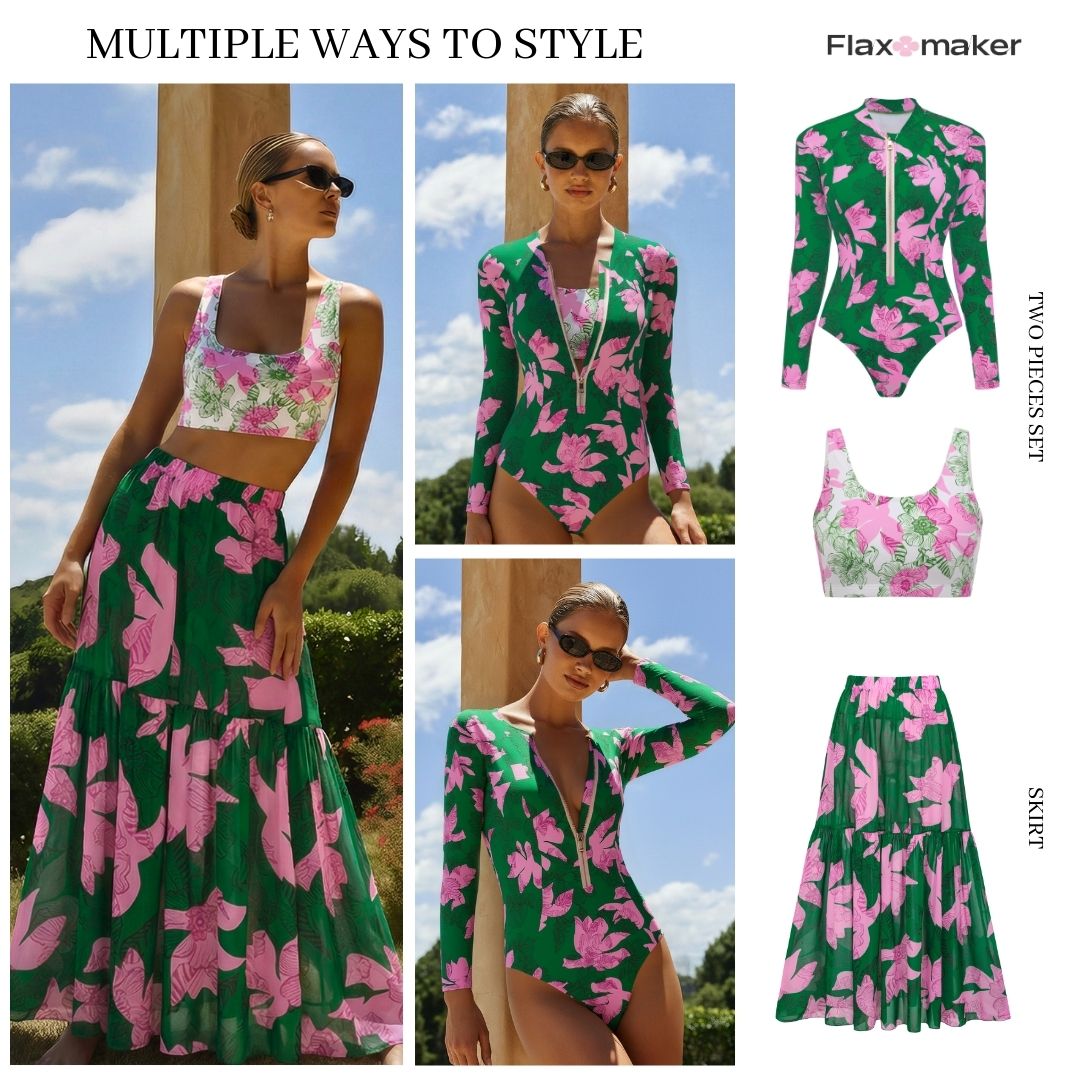 Long-Sleeved Classic Majolica Series Pattern Print One Piece Swimsuit and Skirt or Shorts