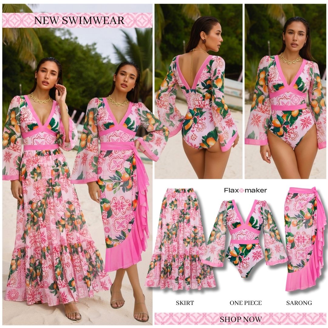 V Neck Long Sleeve Lemon Print Swimsuit Set(s)