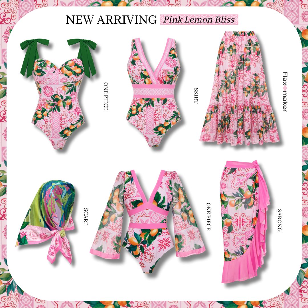 Lemon Print Tie-shoulder One Piece Swimsuit and Sarong or Skirt Flaxmaker