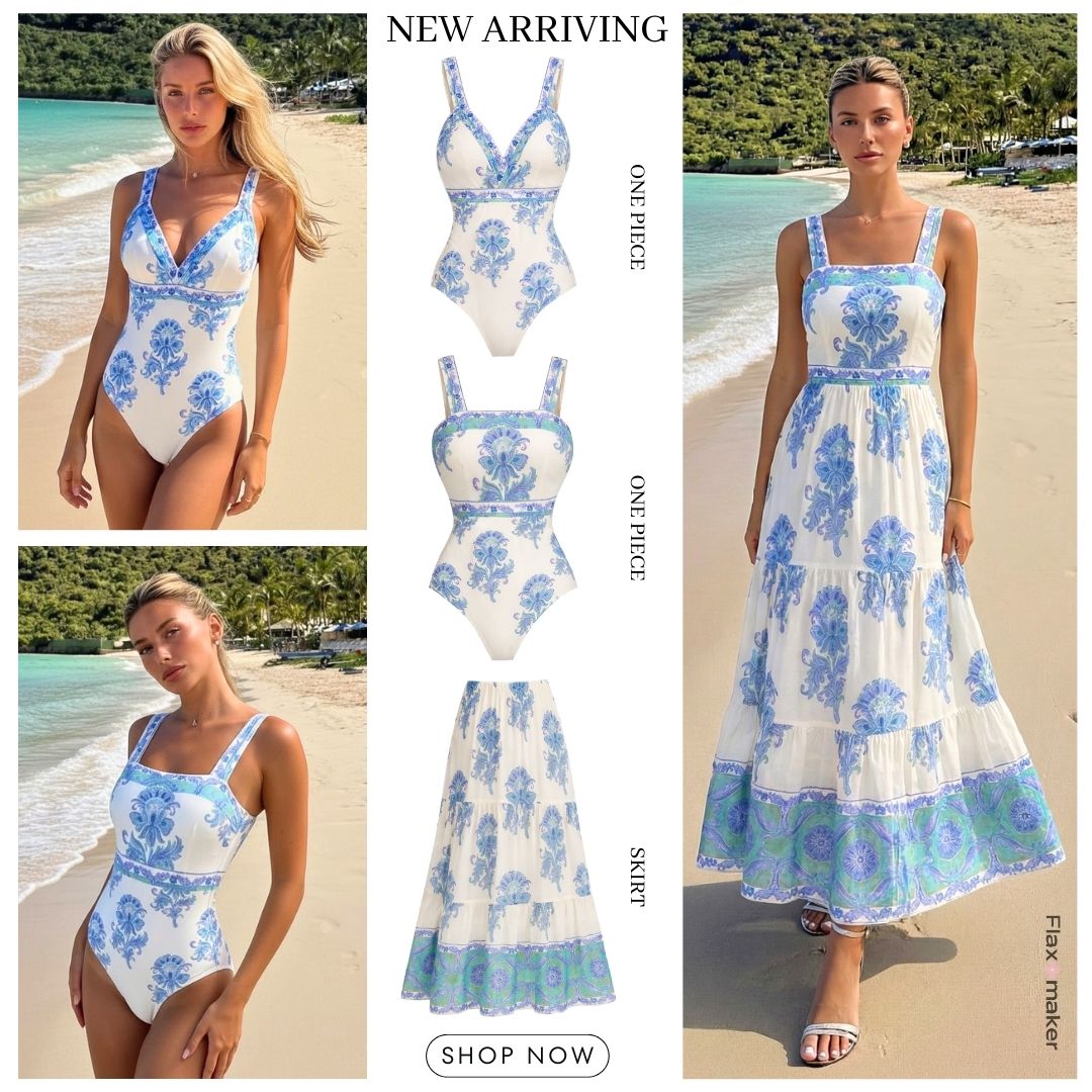 Sling Classic Majolica Series Pattern Print One Piece Swimsuit and Skirt or Shorts