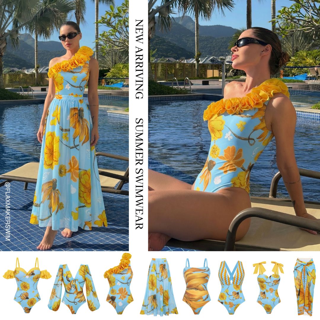 Lemon Print Tie-shoulder One Piece Swimsuit and Sarong or Skirt Flaxmaker
