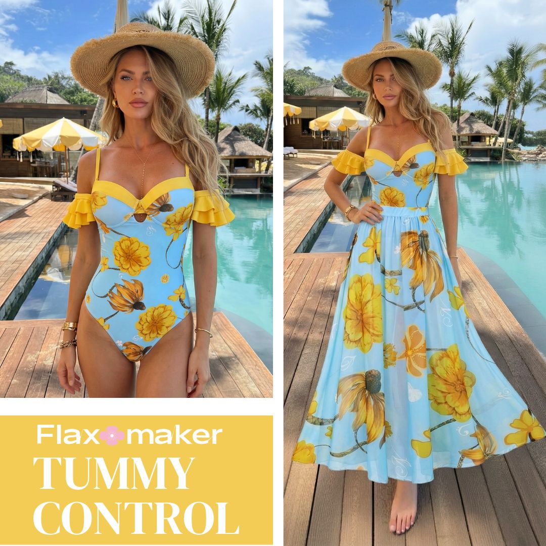 Lemon Print Tie-shoulder One Piece Swimsuit and Sarong or Skirt Flaxmaker