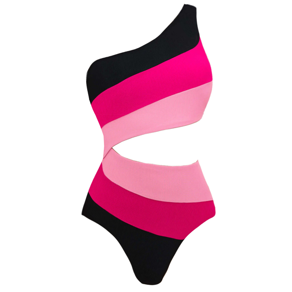 One Shoulder Ruffle Stripe Print One Piece Swimsuit and Skirt