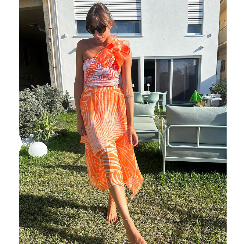 One Shoulder Ruffle Stripe Print One Piece Swimsuit and Skirt