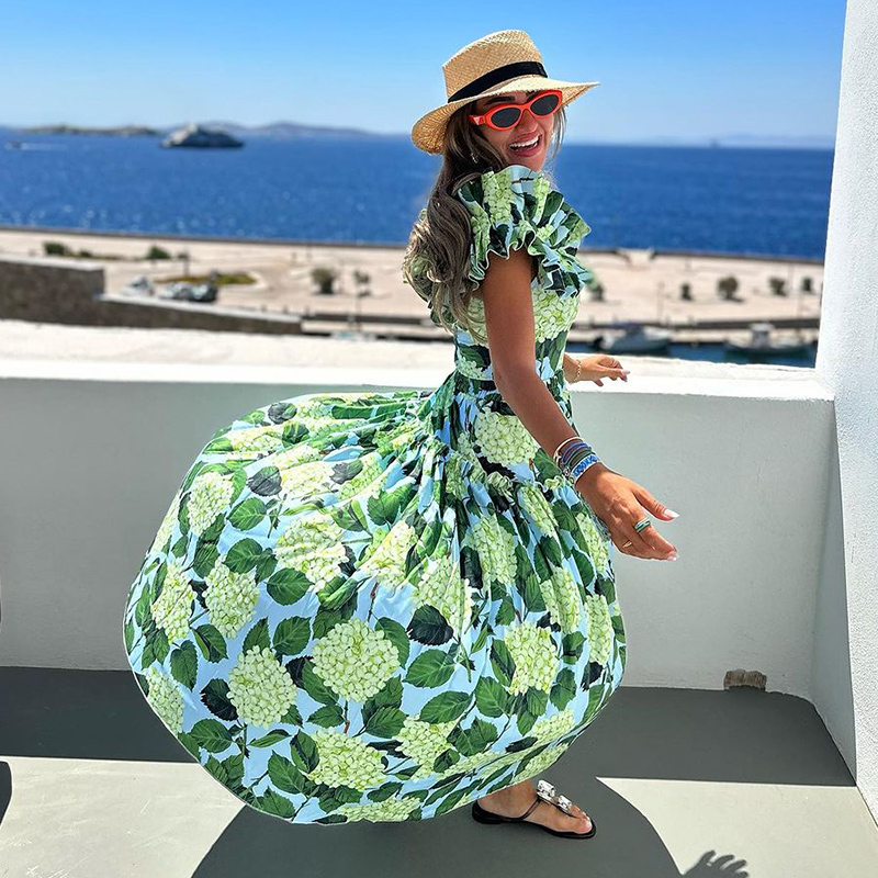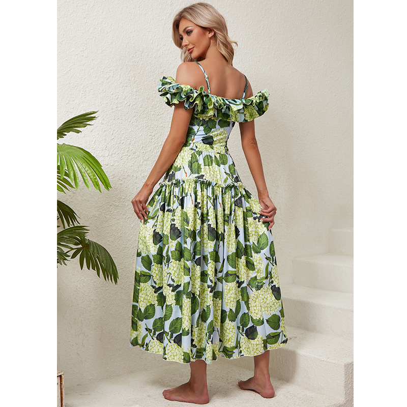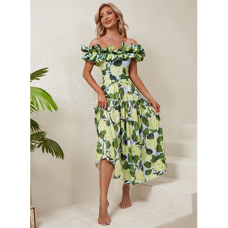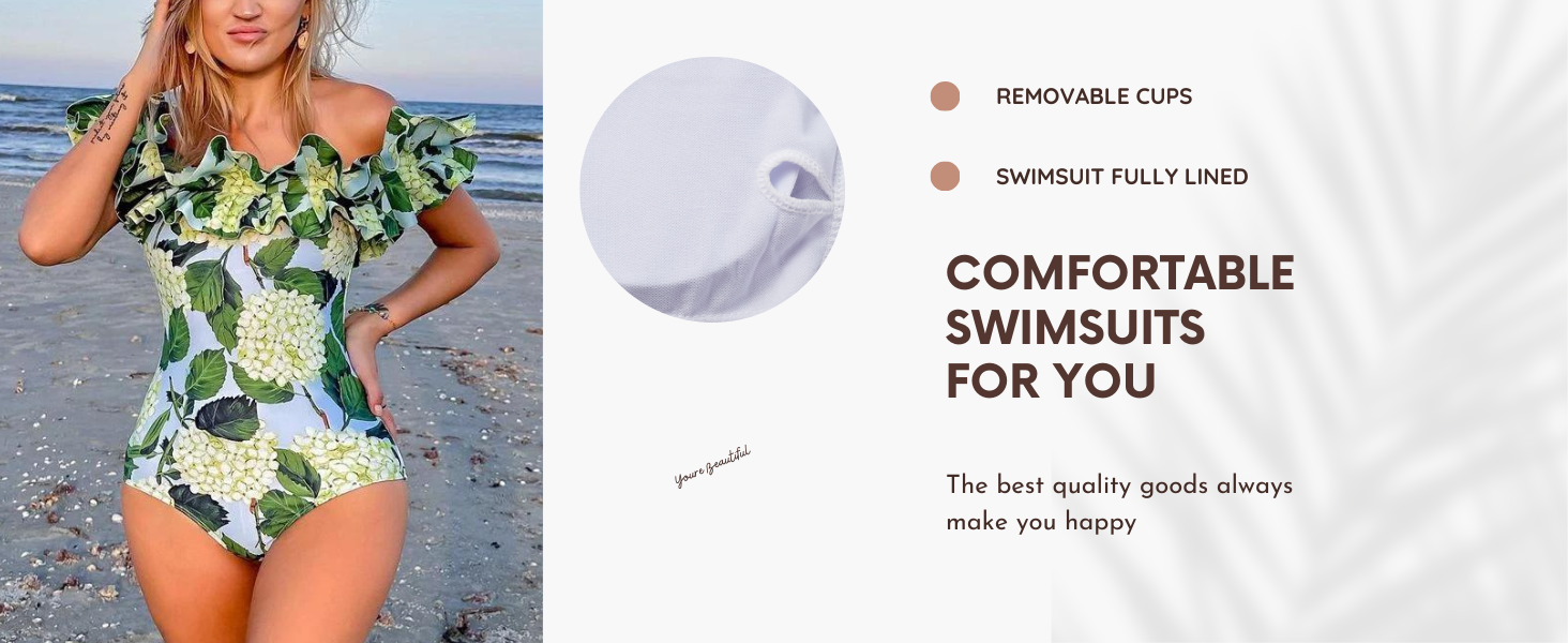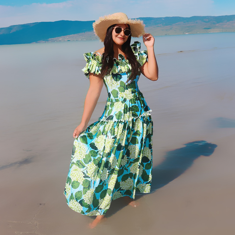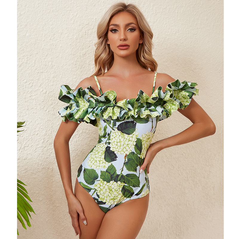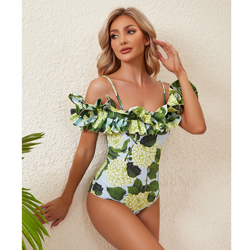 Off Shoulder Hydrangea Print Ruffle One Piece Swimsuit and Skirt Flaxmaker