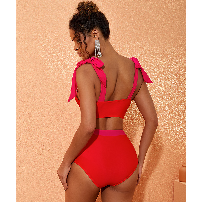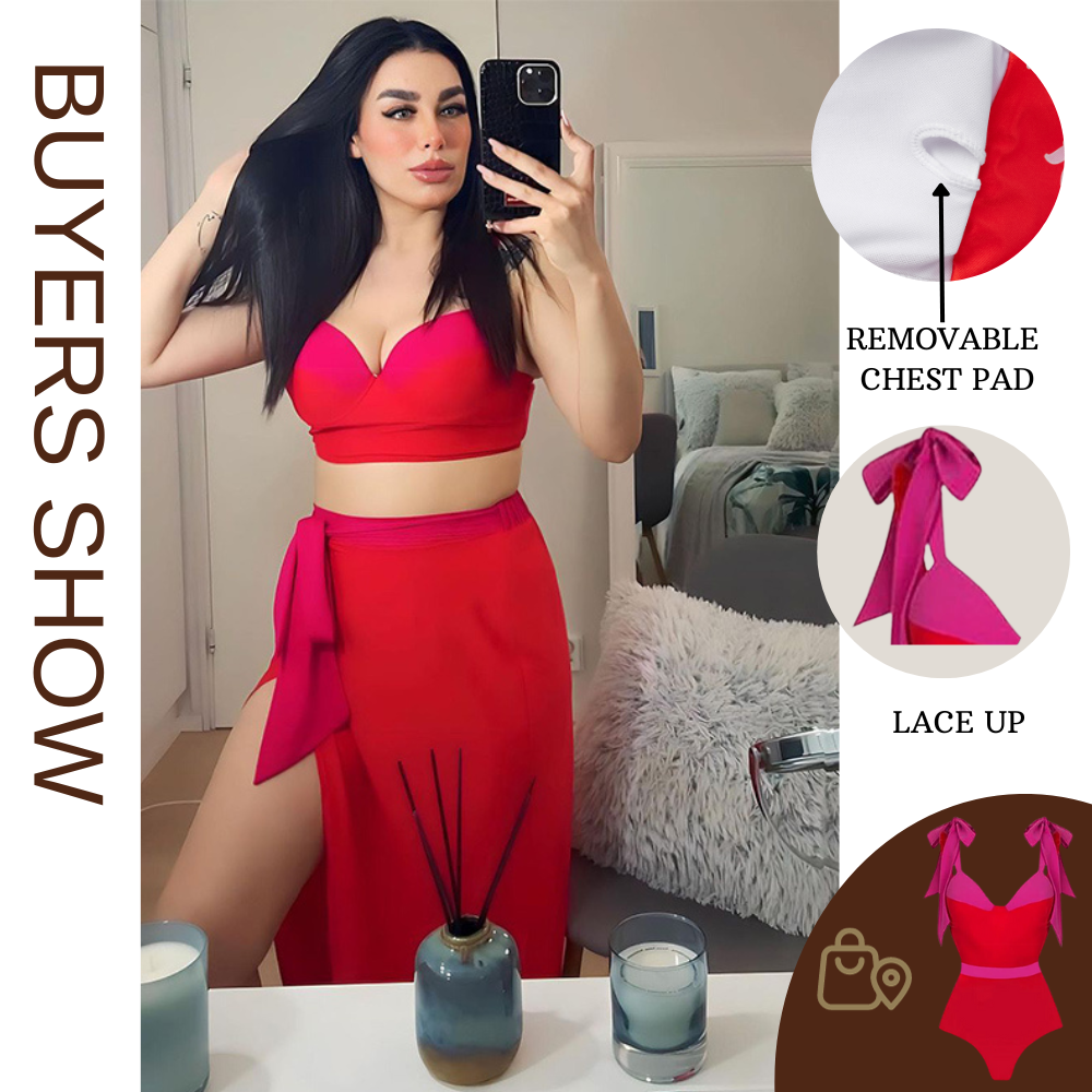 V Neck Solid Color Laser Cutting Flower One Piece Swimsuit and Skirt