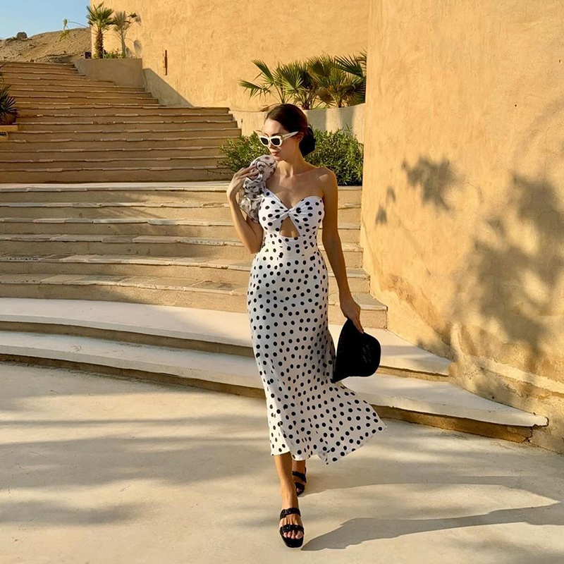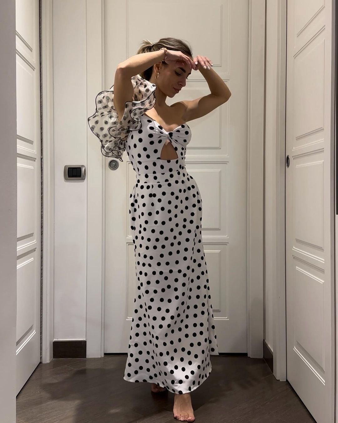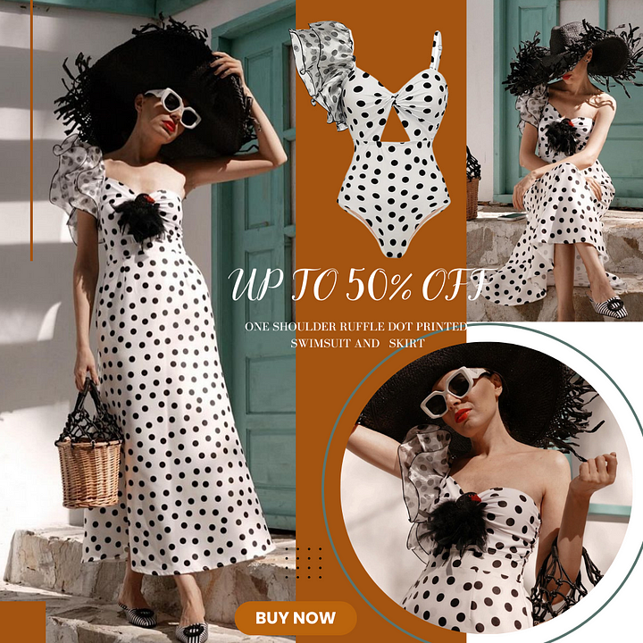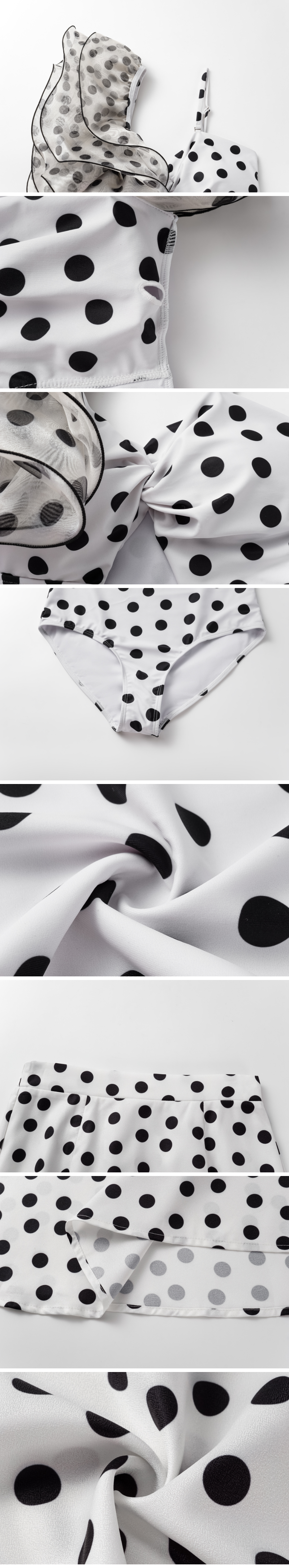 One Shoulder Ruffle Dot Printed Cut Out One Piece Swimsuit and Skirt Flaxmaker