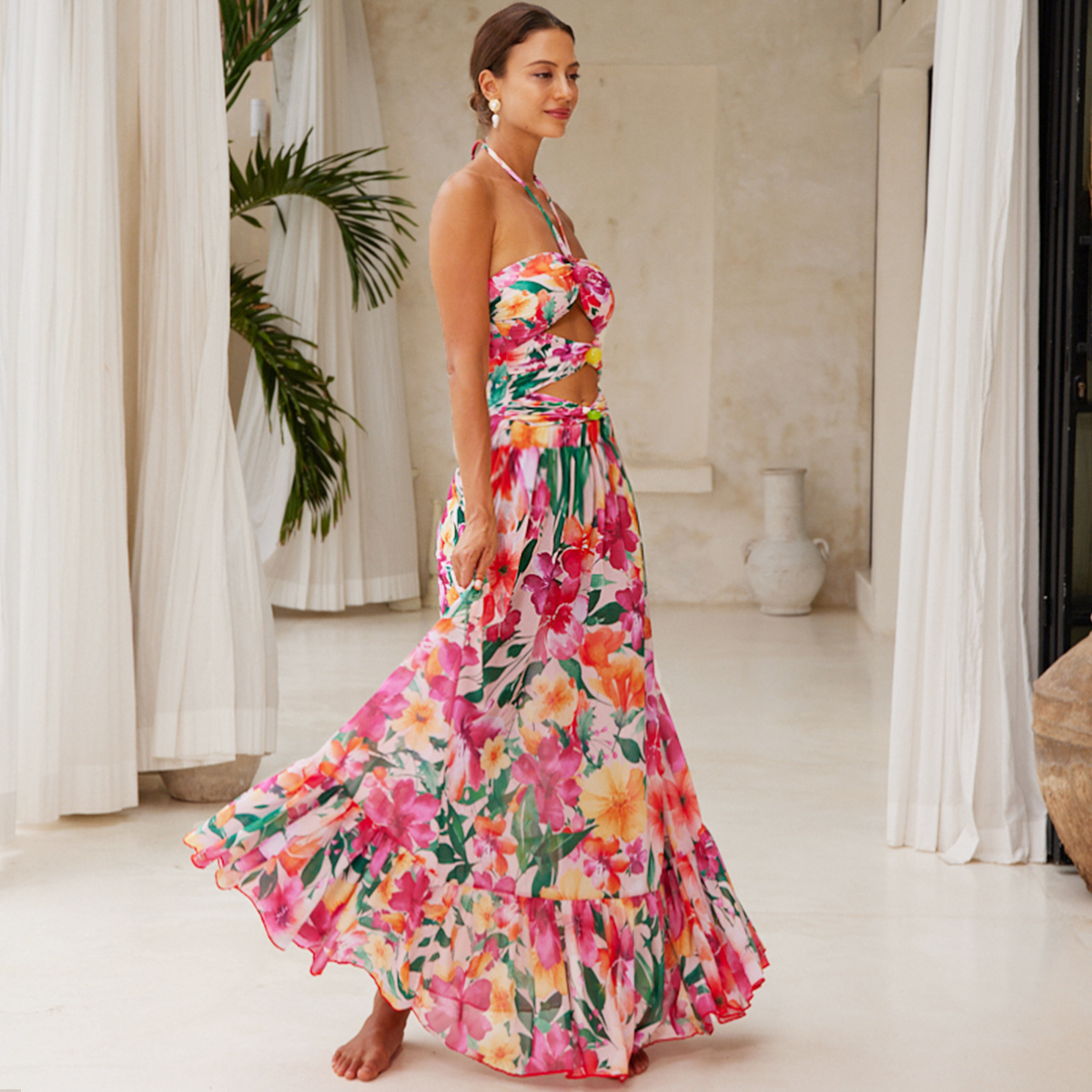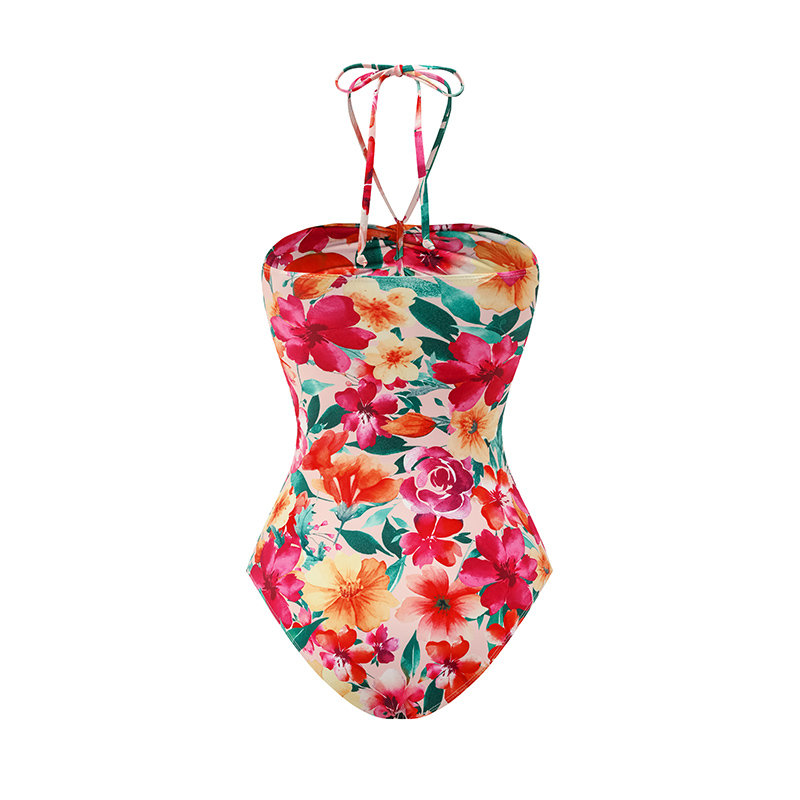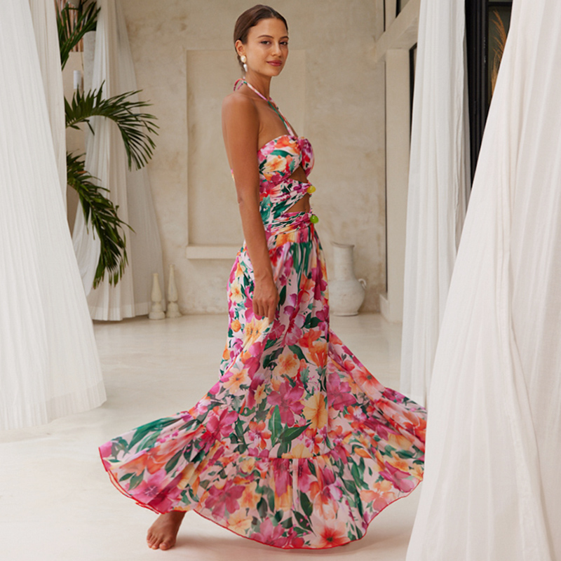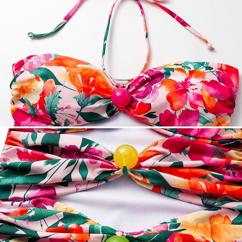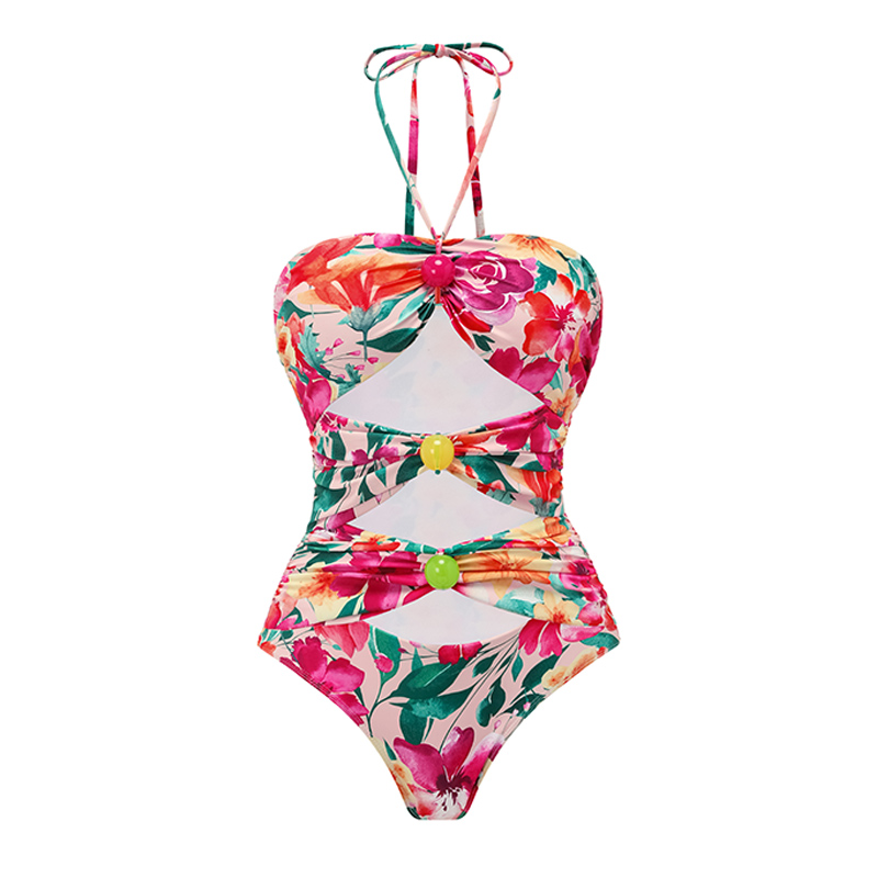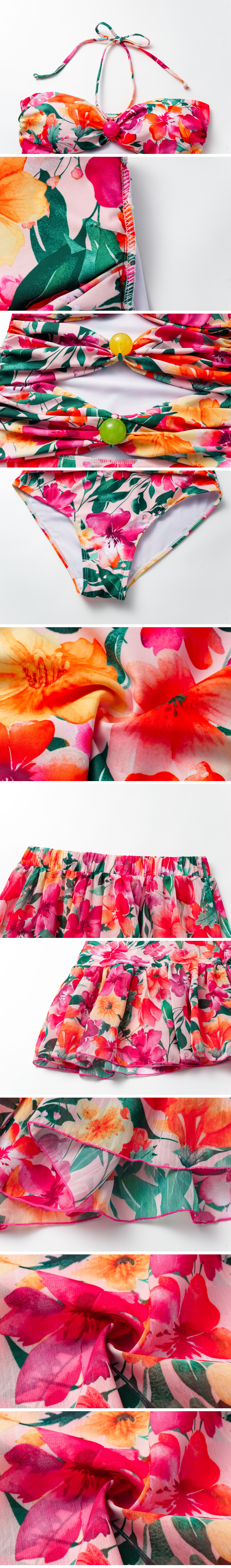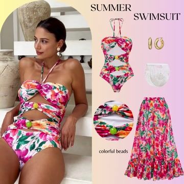 Halter Color Bead Printed One Piece Swimsuit and Skirt Flaxmaker
