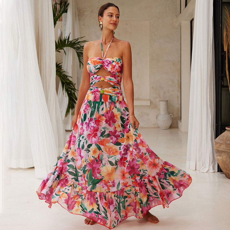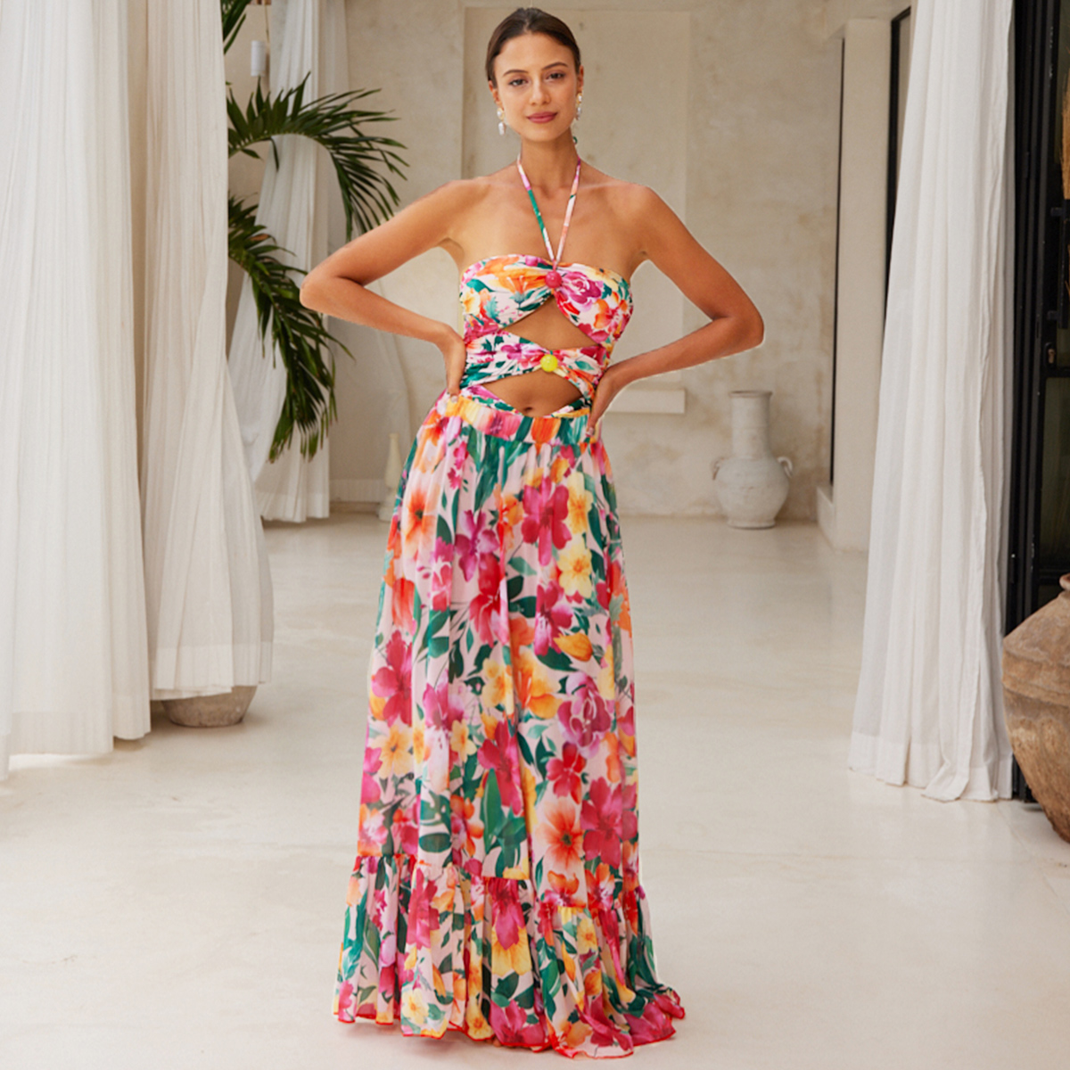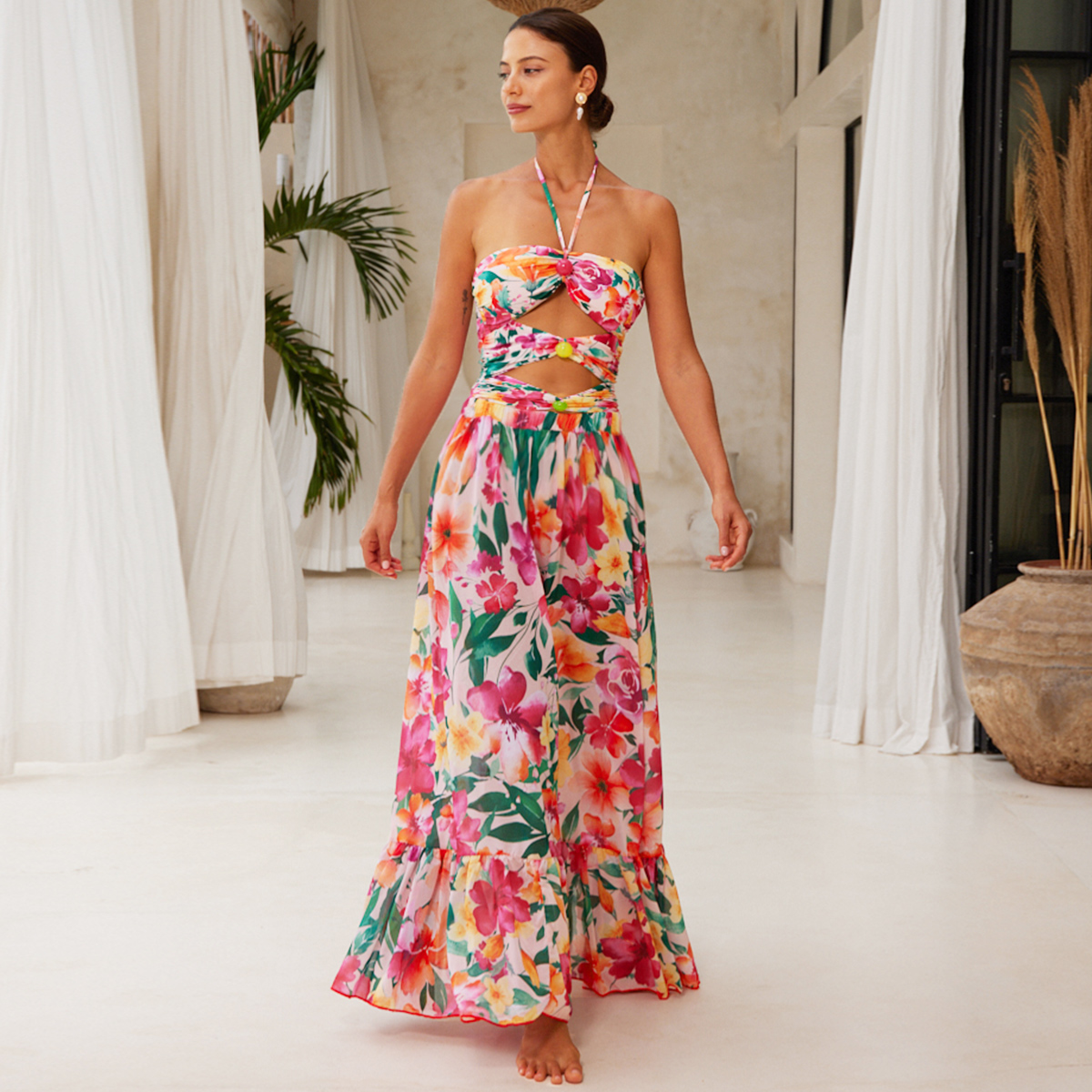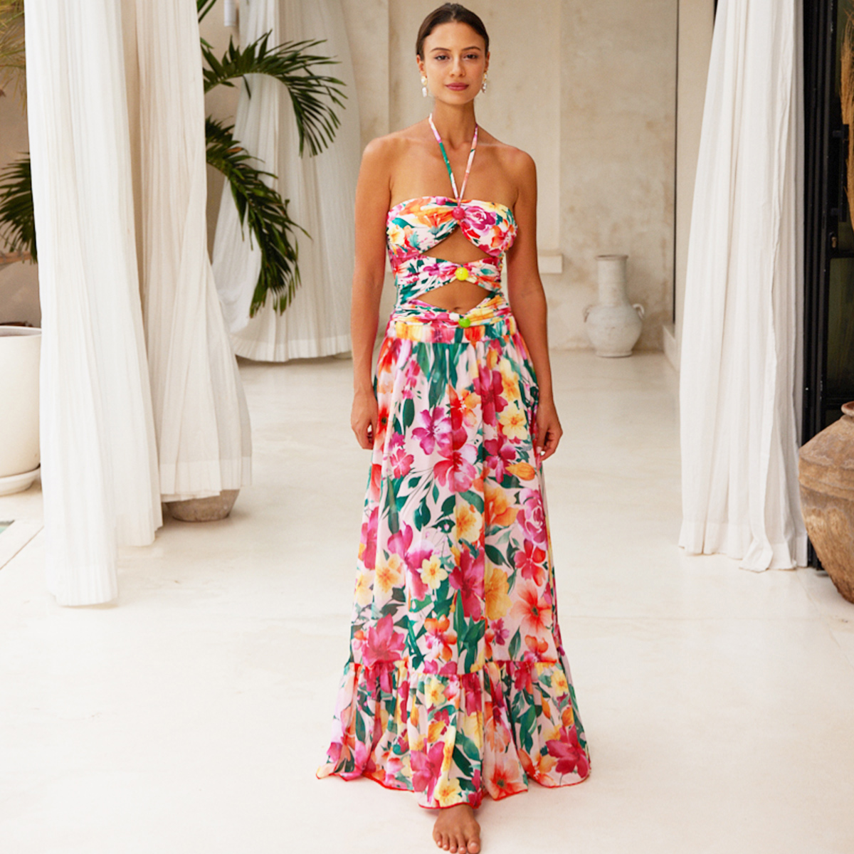 Halter Color Bead Printed One Piece Swimsuit and Skirt Flaxmaker