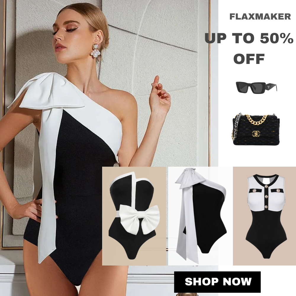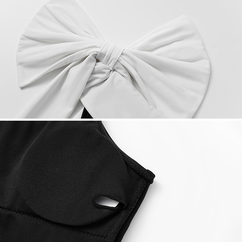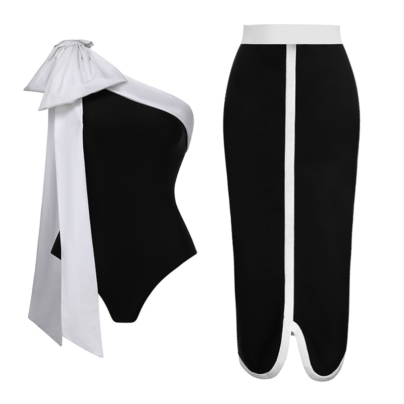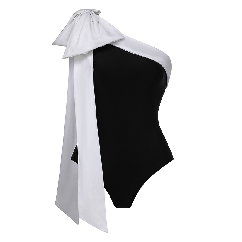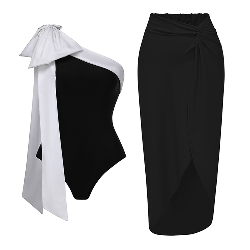One Shoulder Bow Tie Color Block One Piece Swimsuit and Skirt Flaxmaker
