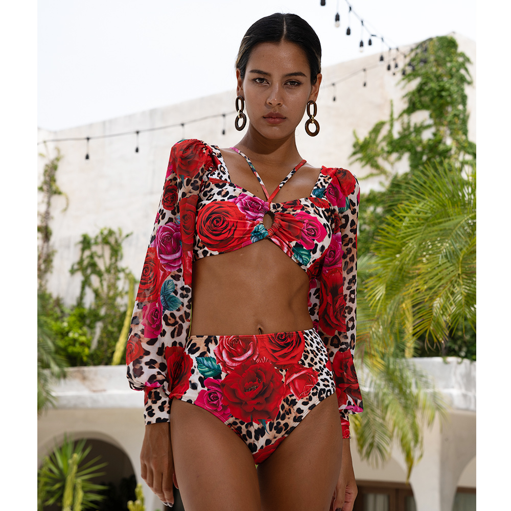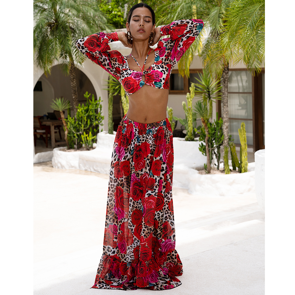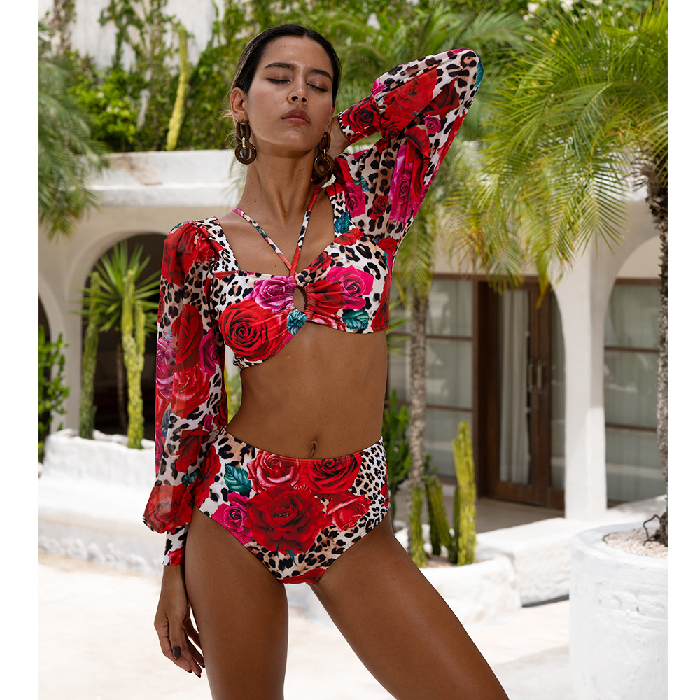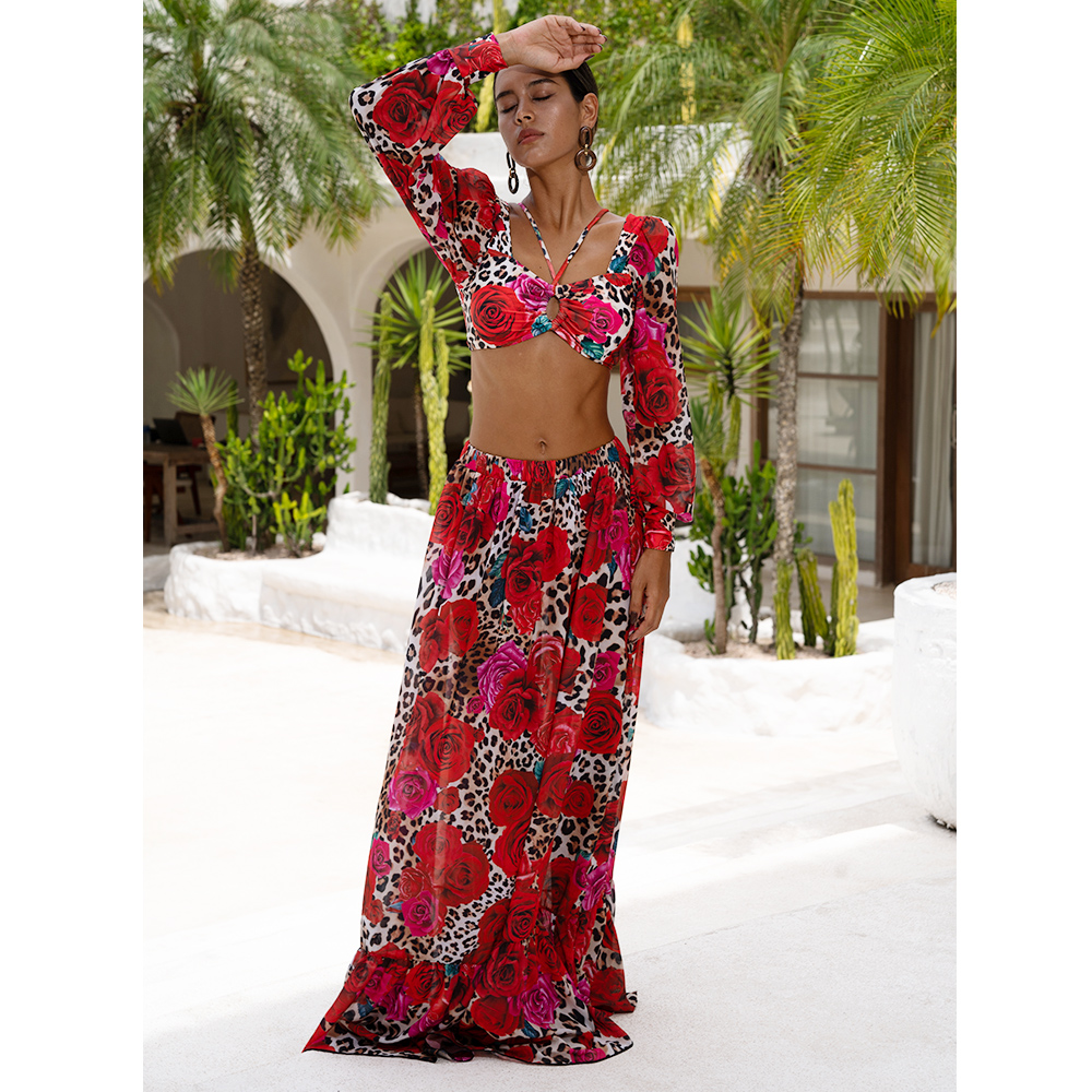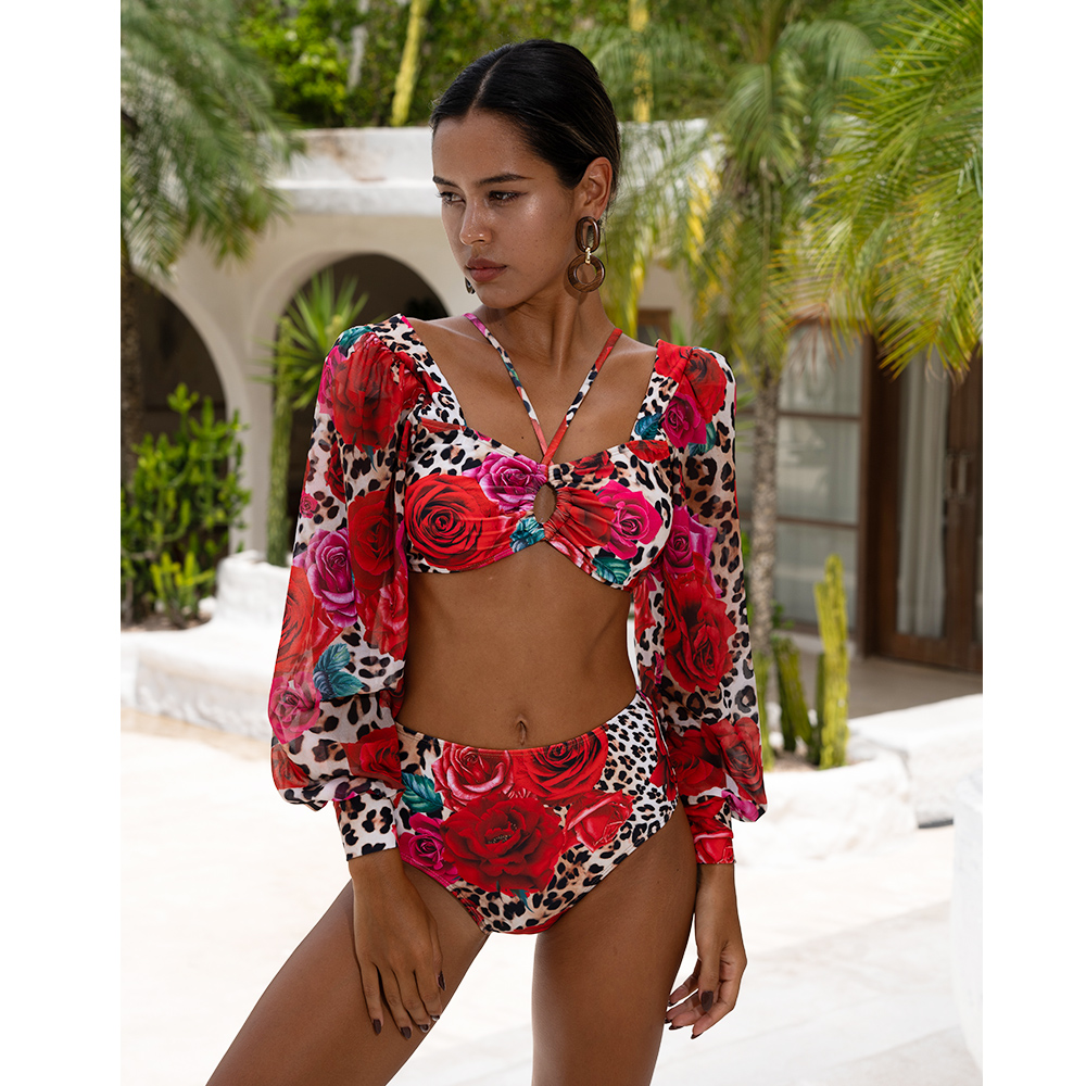 Lace Up Chiffon Long Sleeves Leopard Print High Waist Bikini Swimsuit and Skirt
