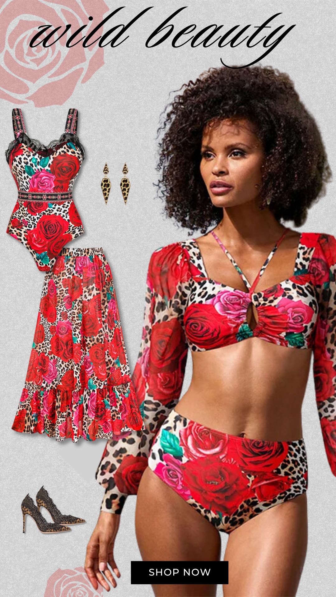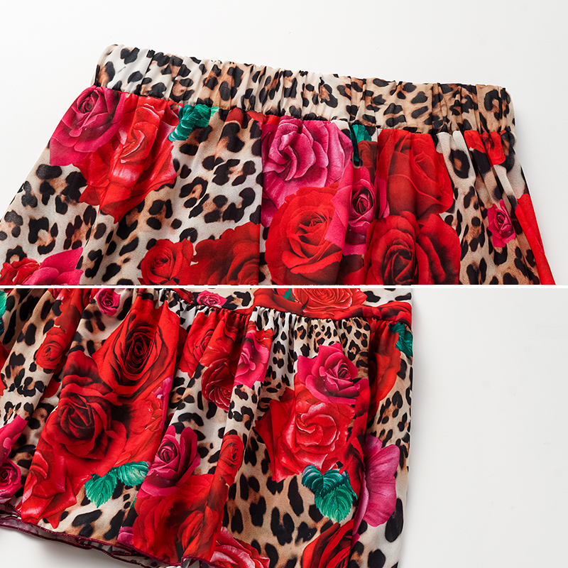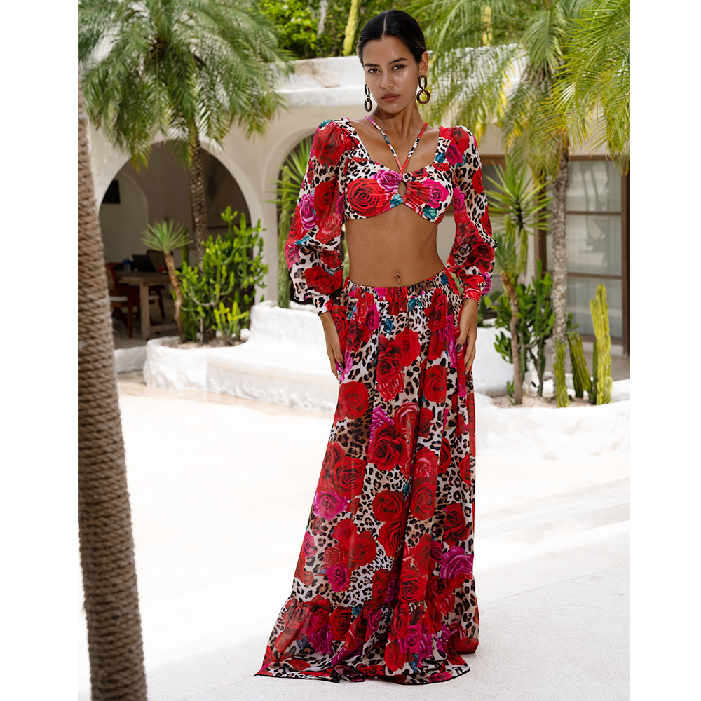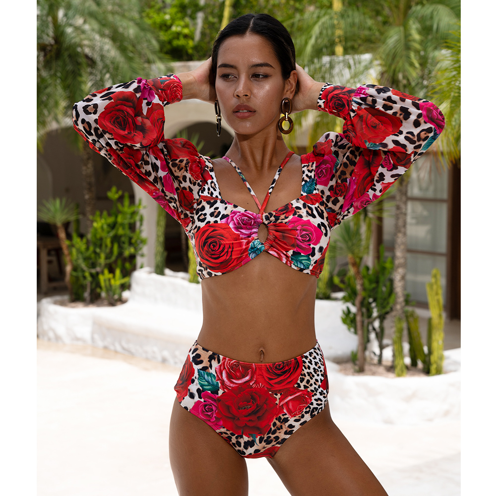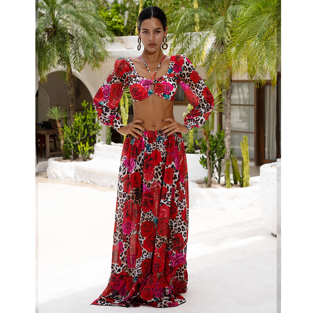 Lace Up Chiffon Long Sleeves Leopard Print High Waist Bikini Swimsuit and Skirt