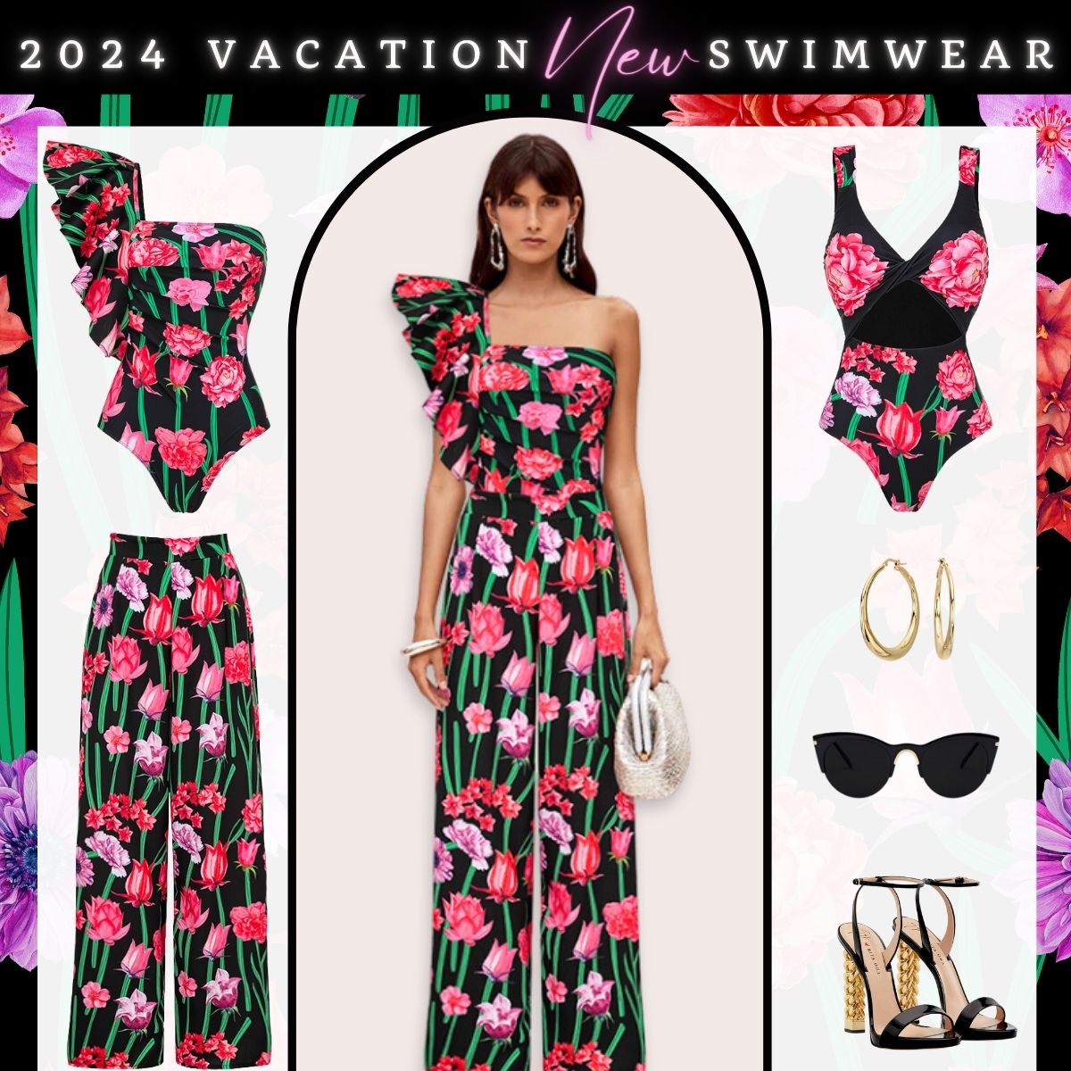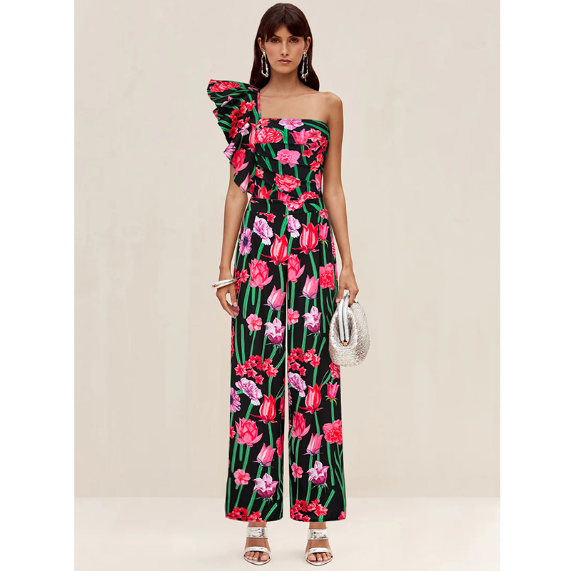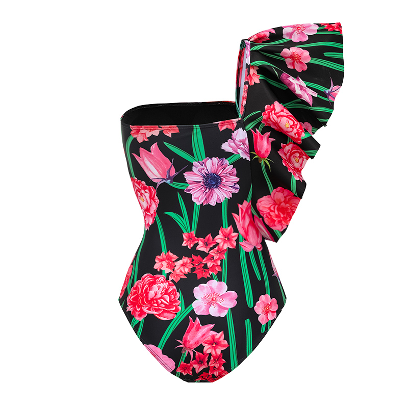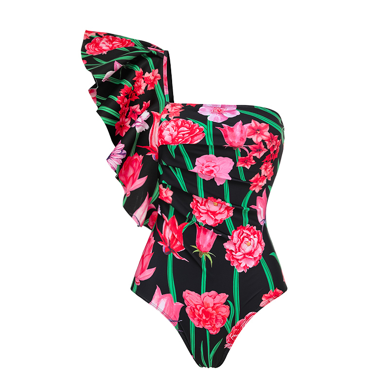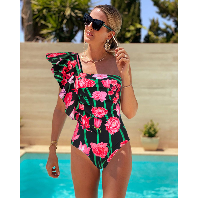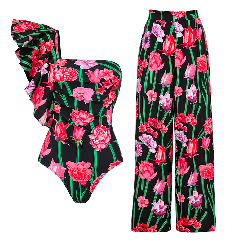 One Shoulder Ruffle Printed One Piece Swimsuit and Pants