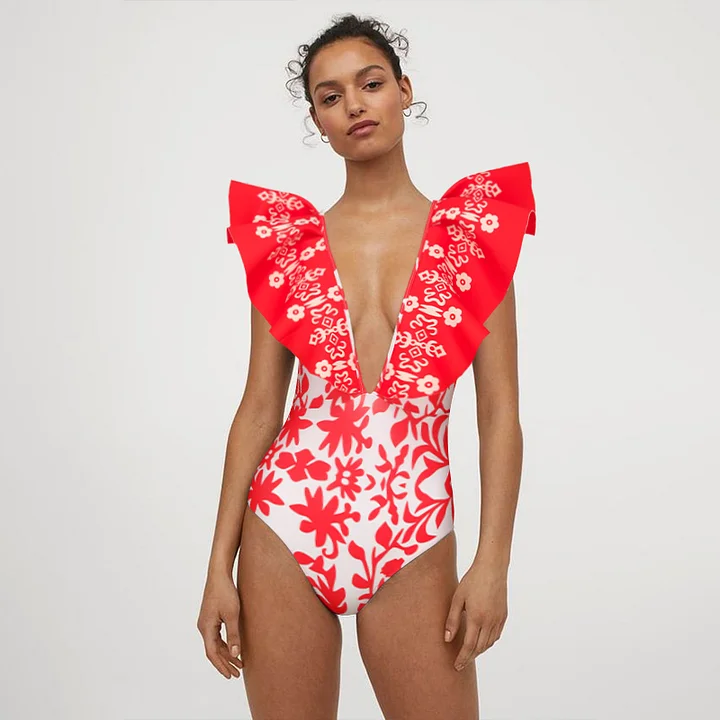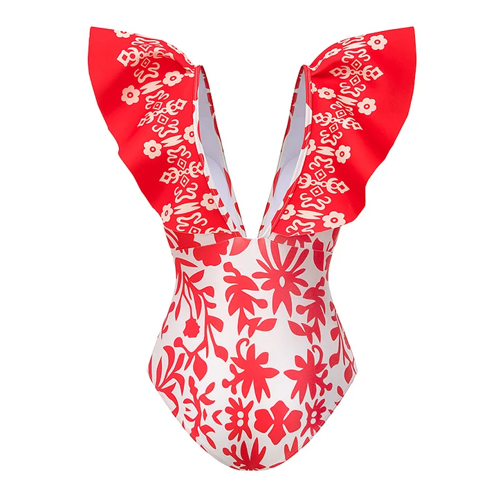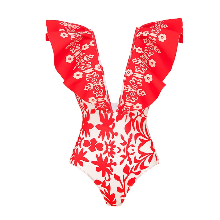 One Shoulder 3D Flower Cut Out Printed One Piece Swimsuit and Skirt