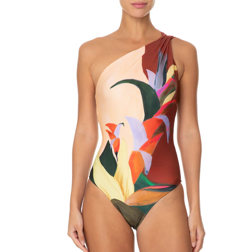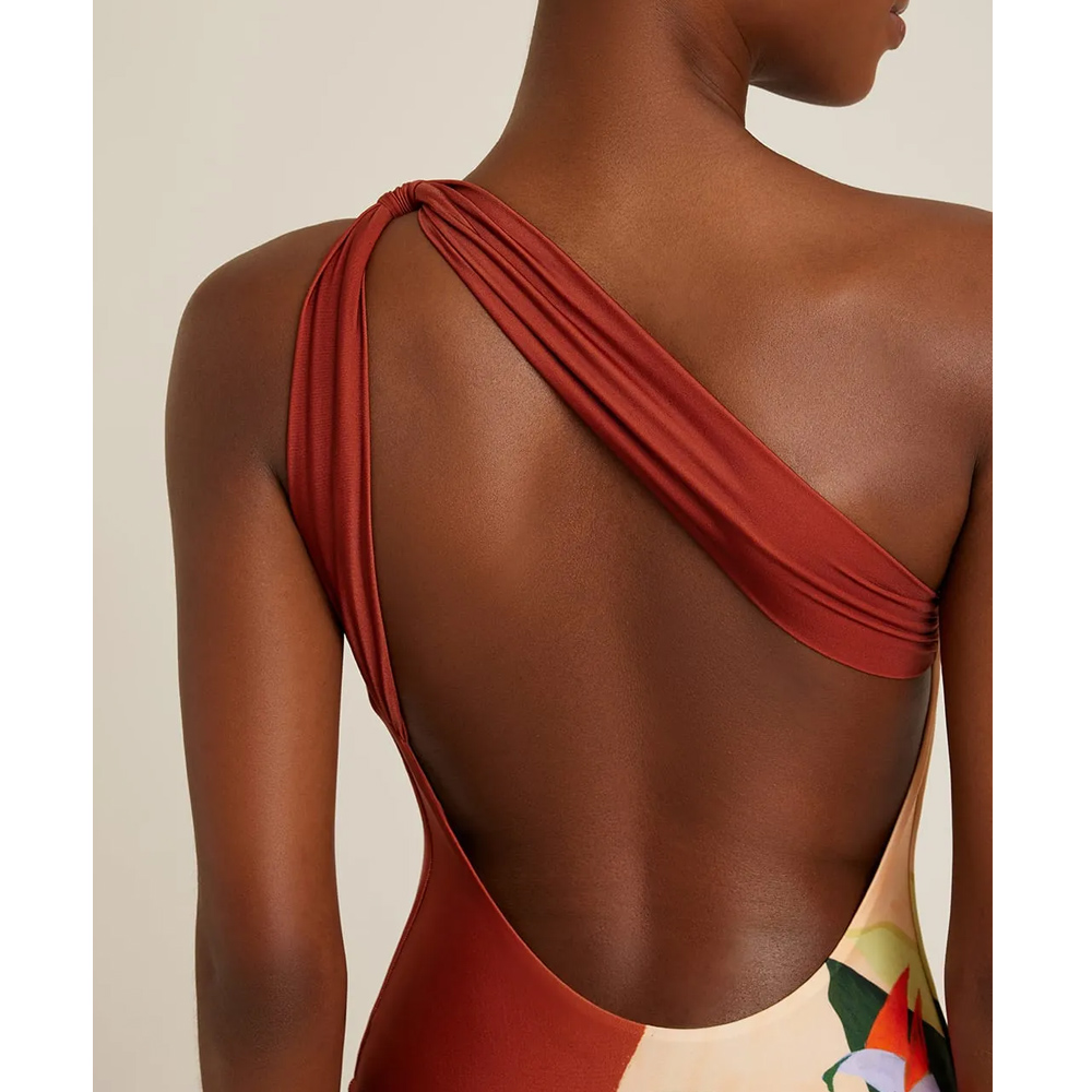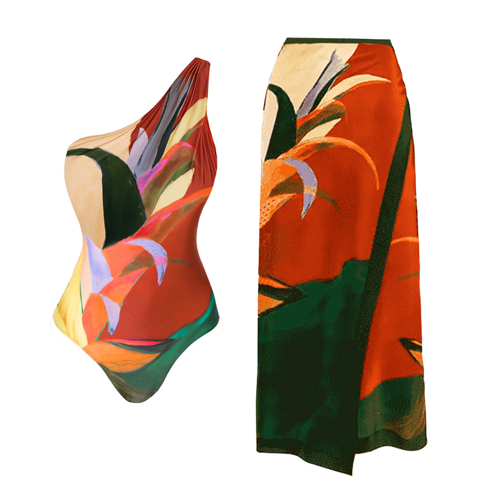 One Shoulder Printed One Piece Swimsuit and Skirt