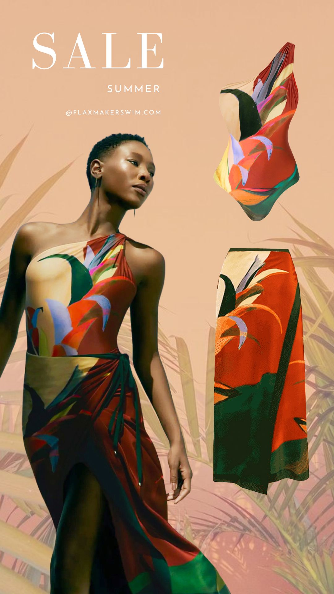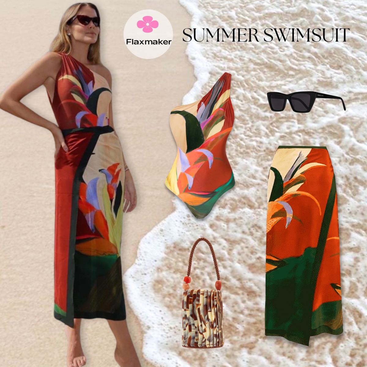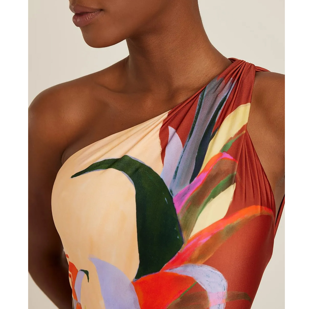 One Shoulder Printed One Piece Swimsuit and Skirt