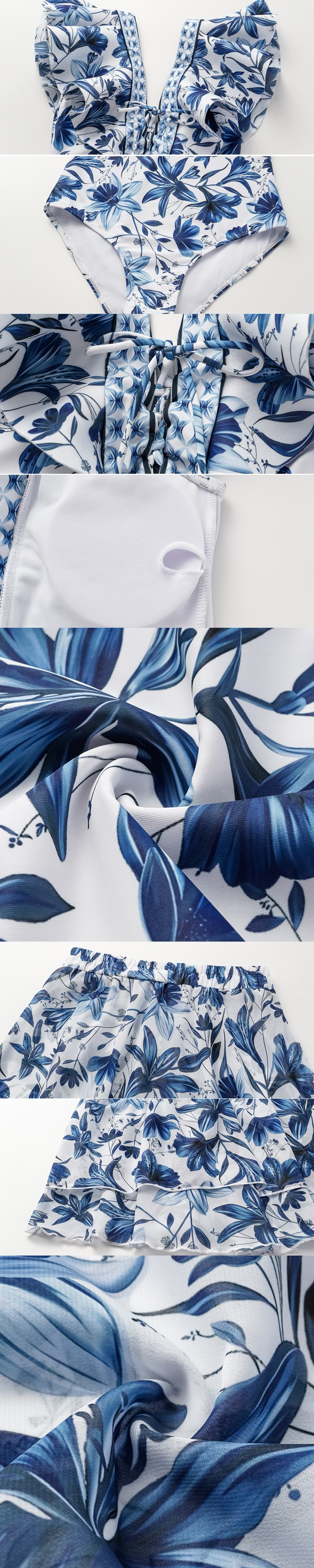 V Neck Ruffle Lace Up Printed One Piece Swimsuit and Skirt