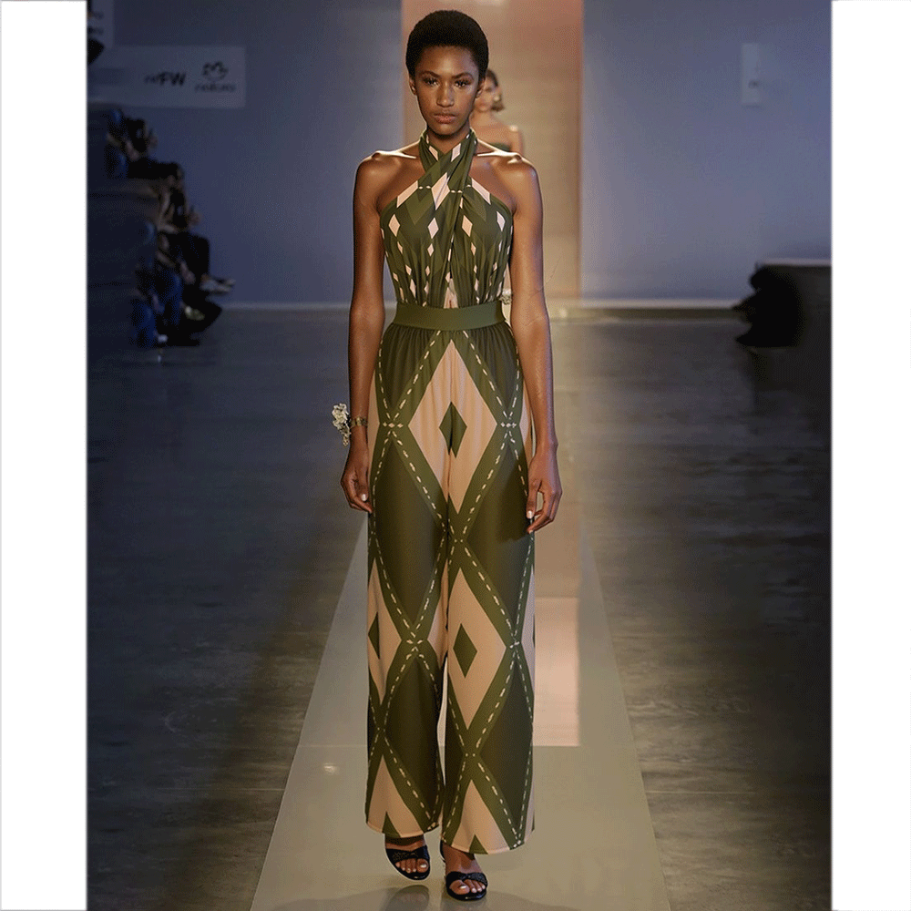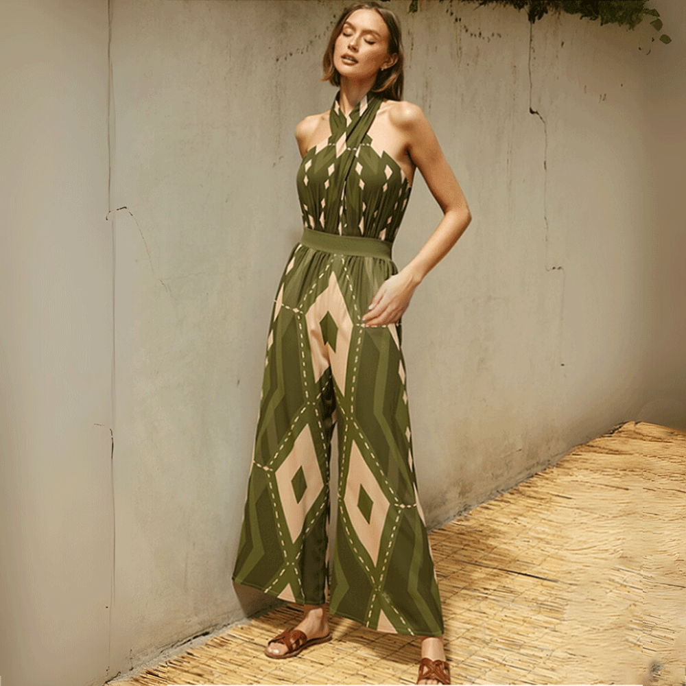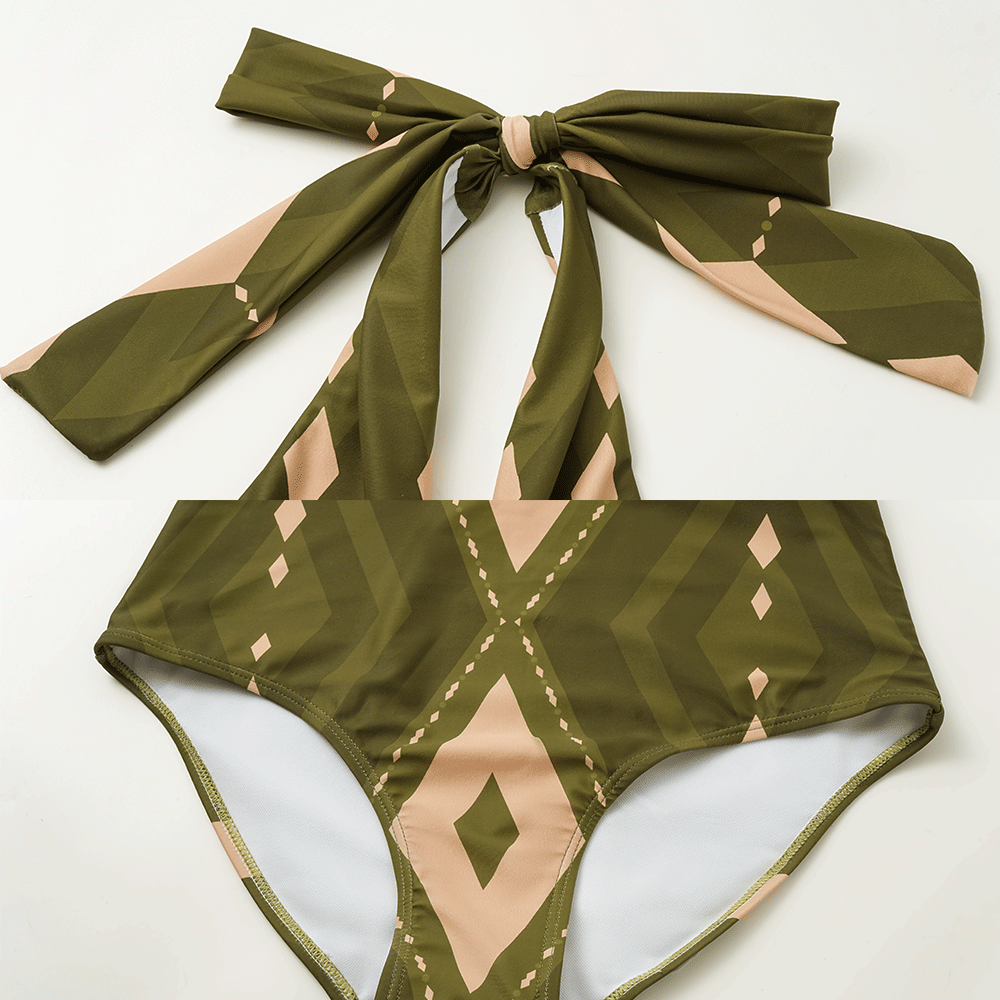 Halter Neck Geometric Pattern Print One Piece Swimsuit and Pants
