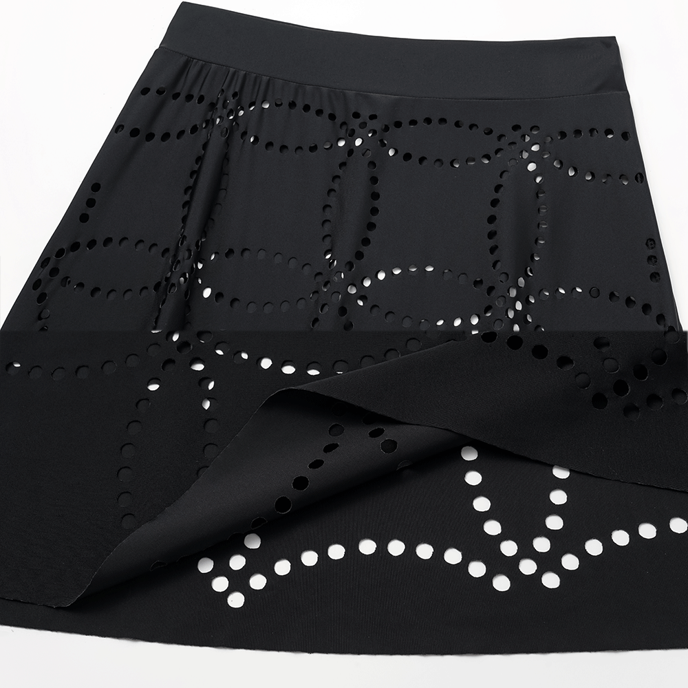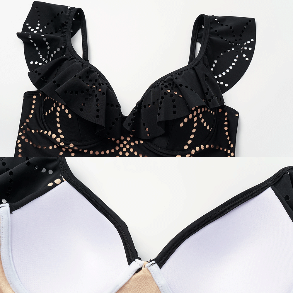 Underwired Black Ruffle Laser Cutting Flower One Piece Swimsuit and Skirt