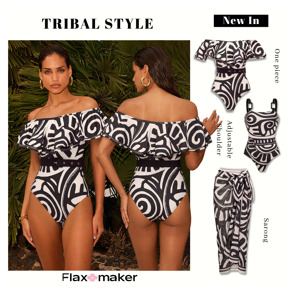 Off Shoulder Black Retro Printed Swimsuit Set(s)