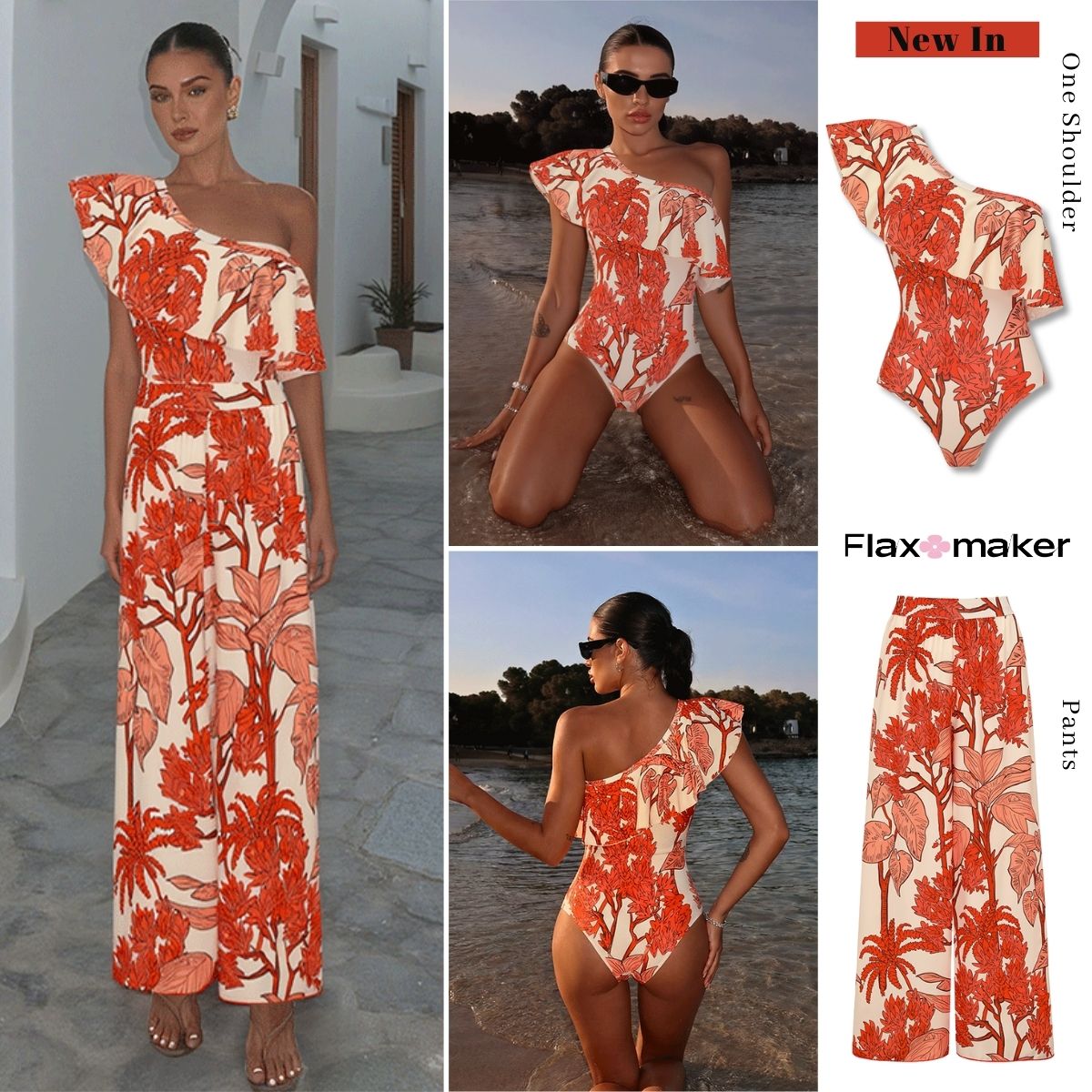 One Shoulder Ruffle Plant Print Swimsuit Set(s)