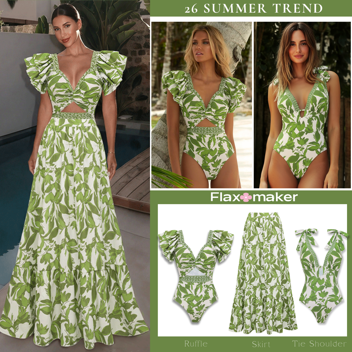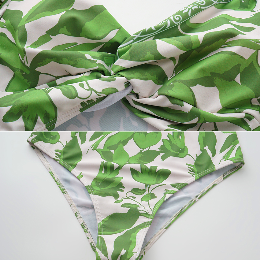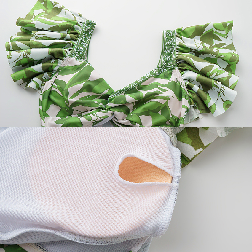 Ruffle V Neck Green Print Cut Out Swimsuit Set(s)