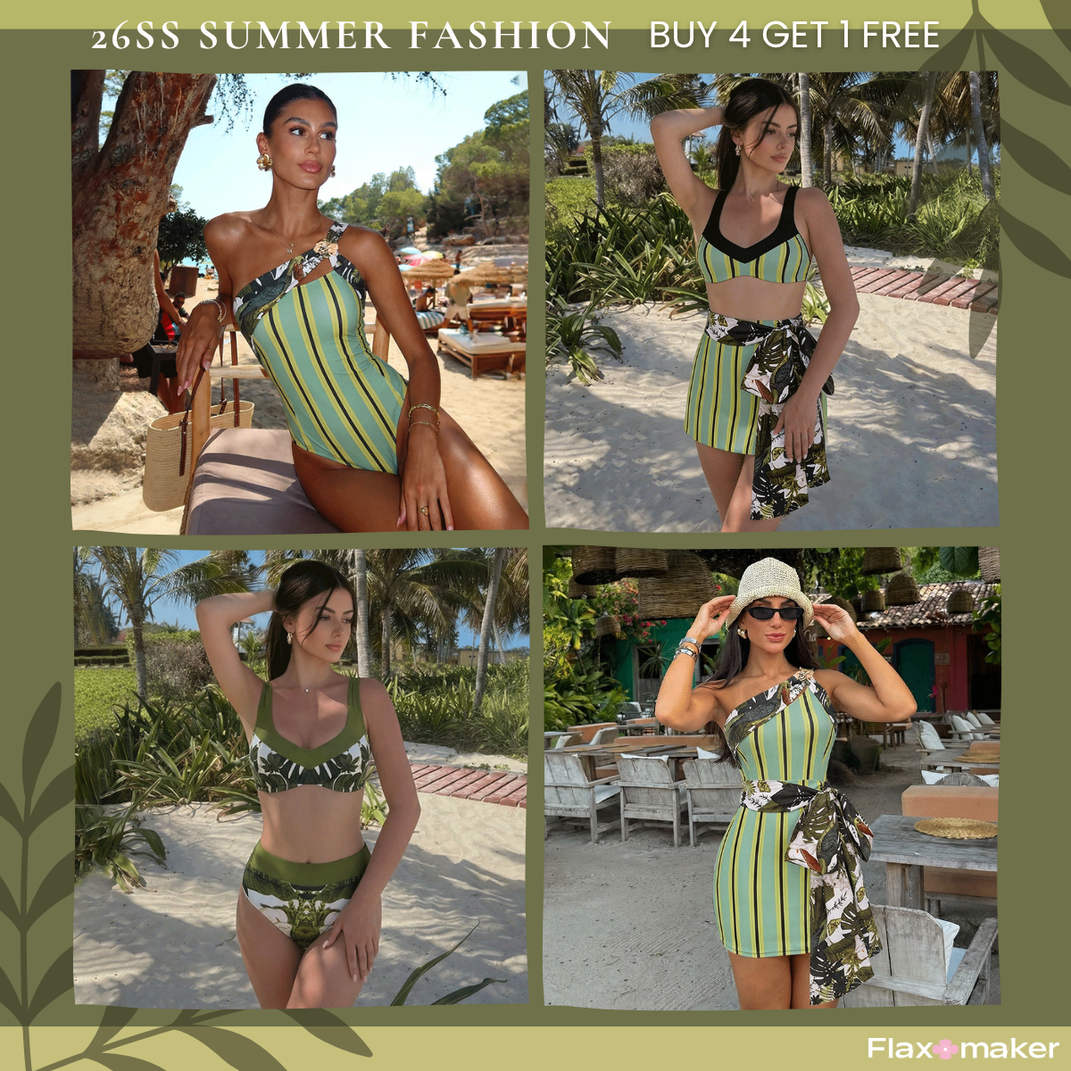 Reversible Green Plant Print High Waist Bikini Swimsuit Set(s)