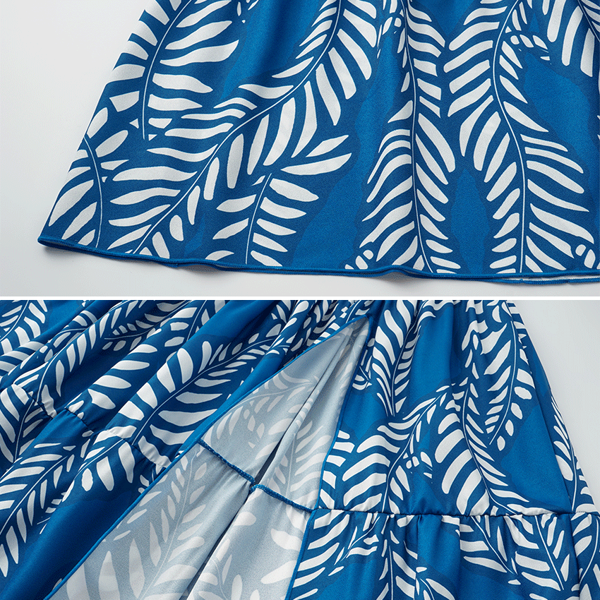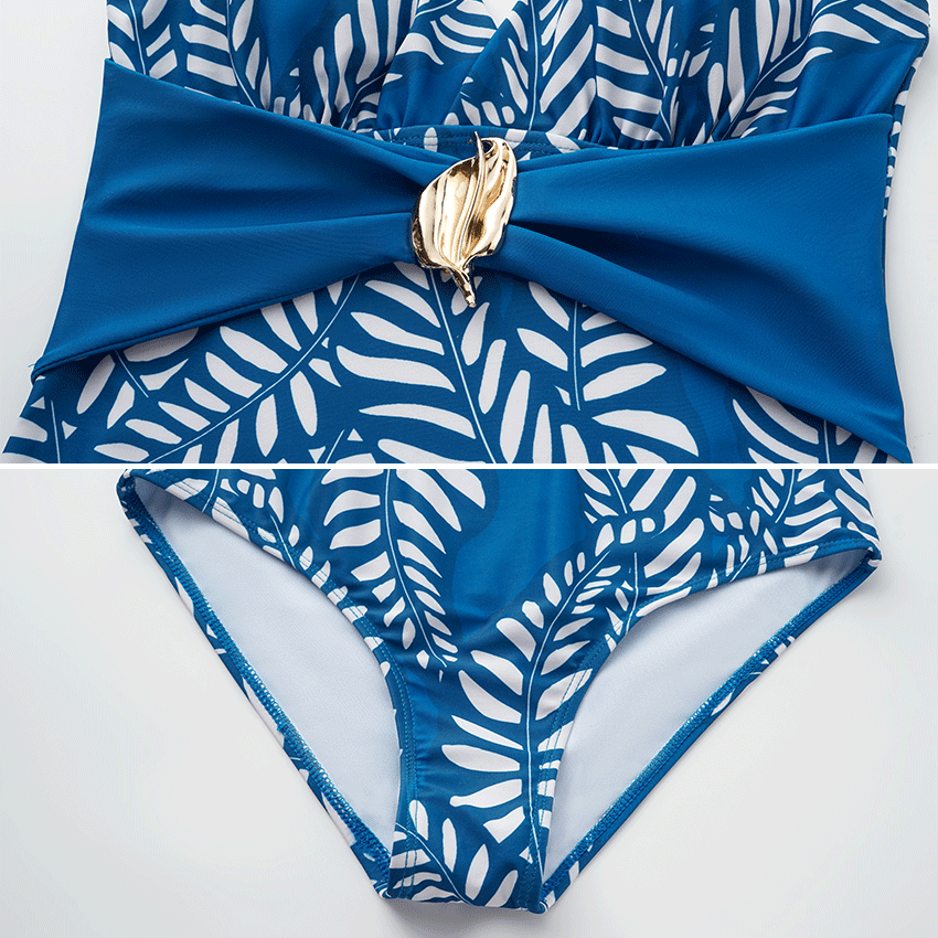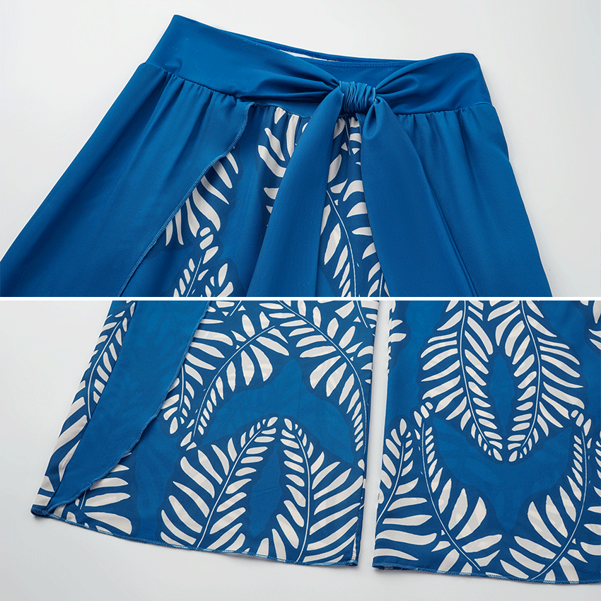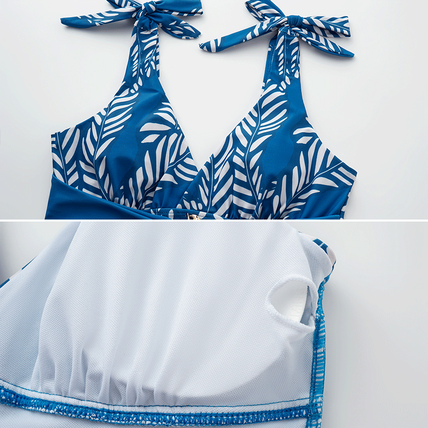 Tie-shoulder Blue Leaves Print Swimsuit Set(s)