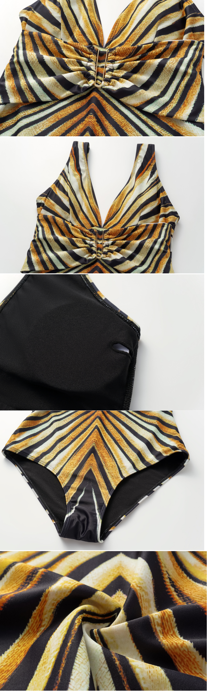V-neck Tiger Stripe Print One Piece Swimsuit and Skirt