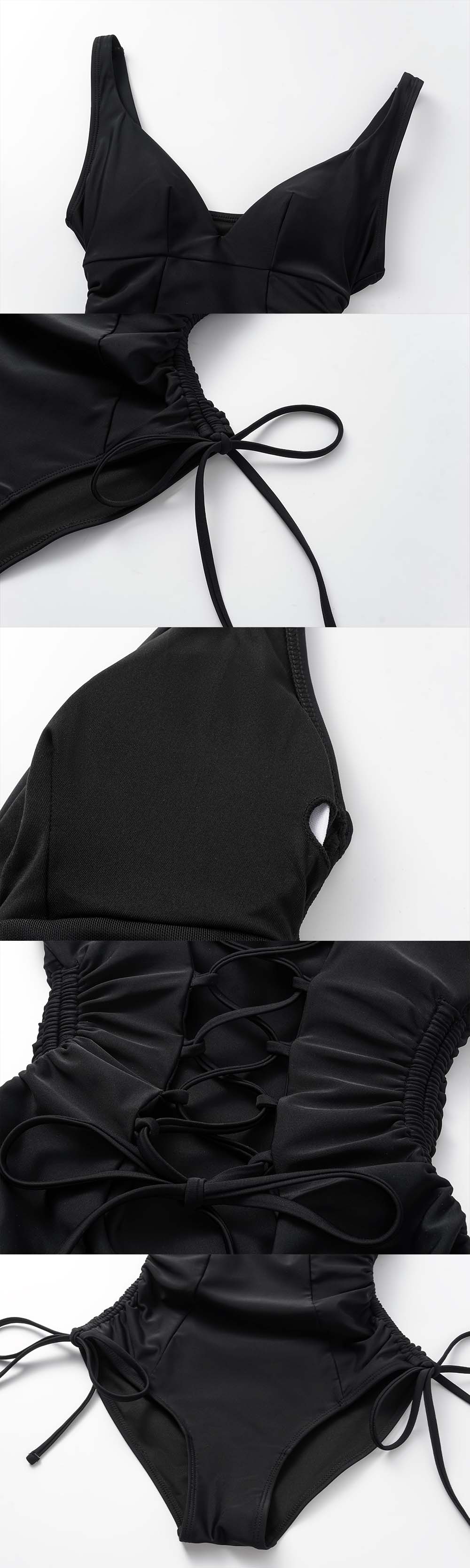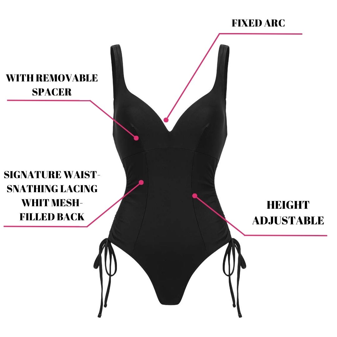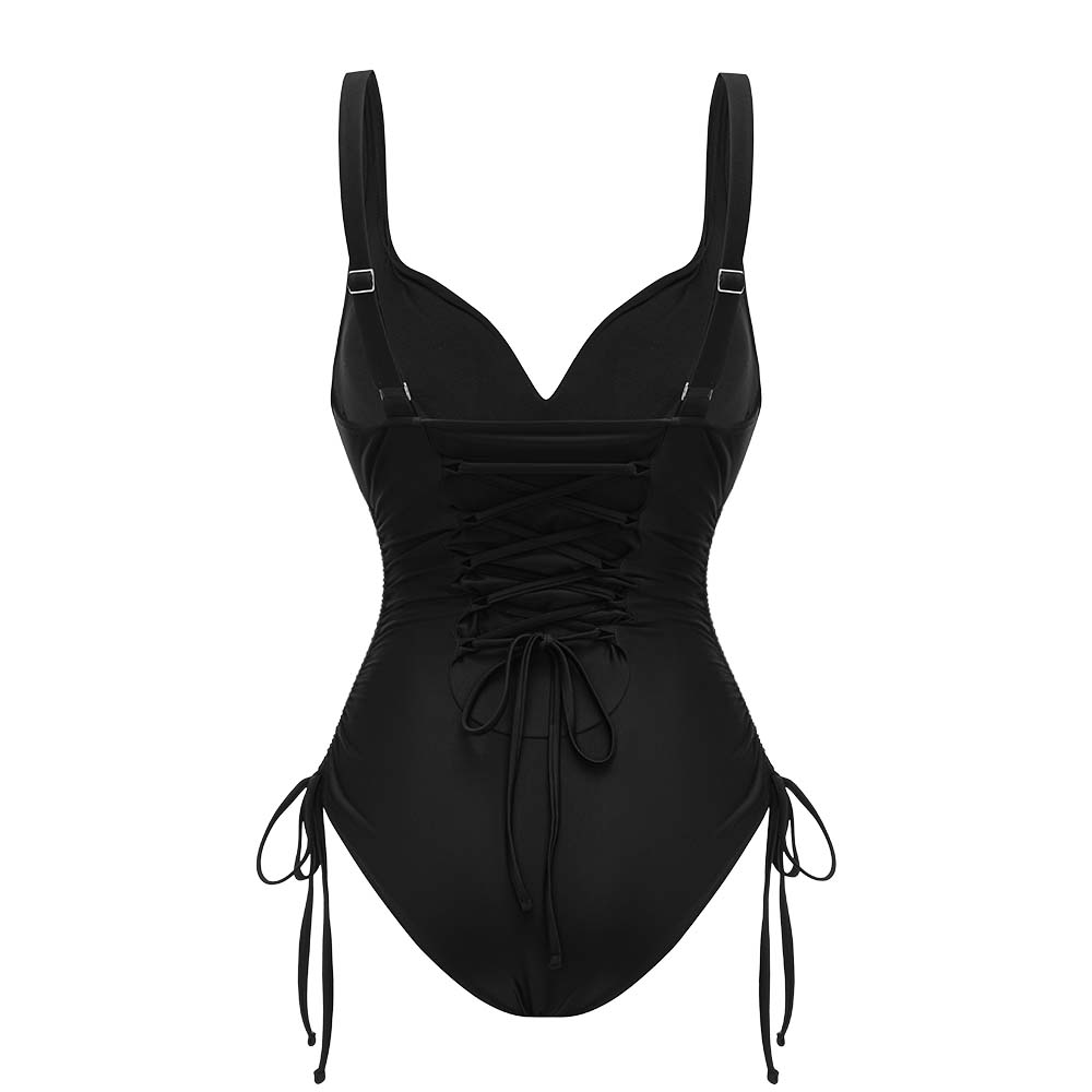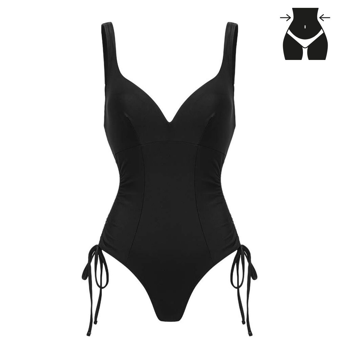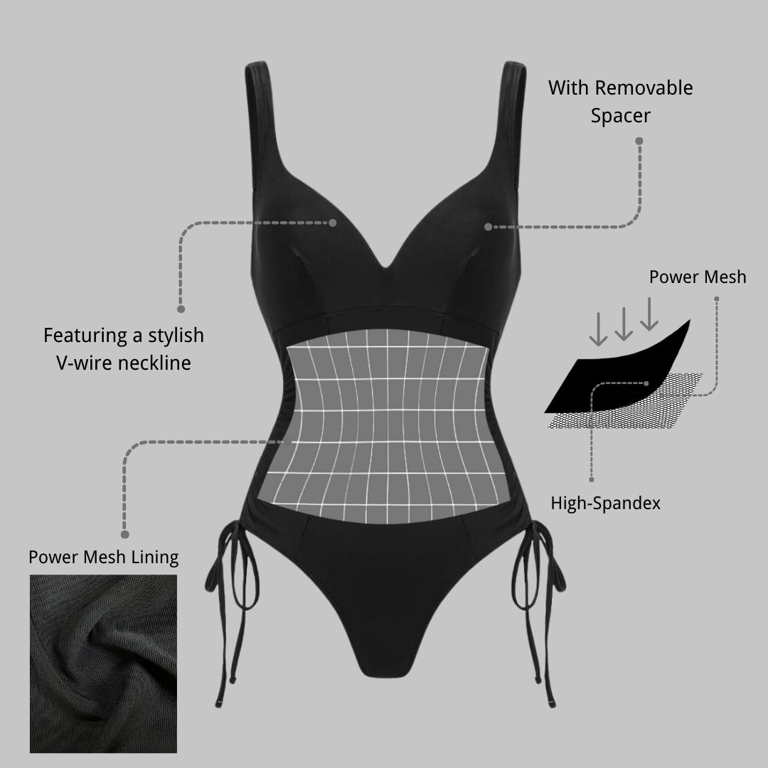 V-Neck Side Seam Drawcord Body Shaping Tummy Control One-Piece Swimsuit