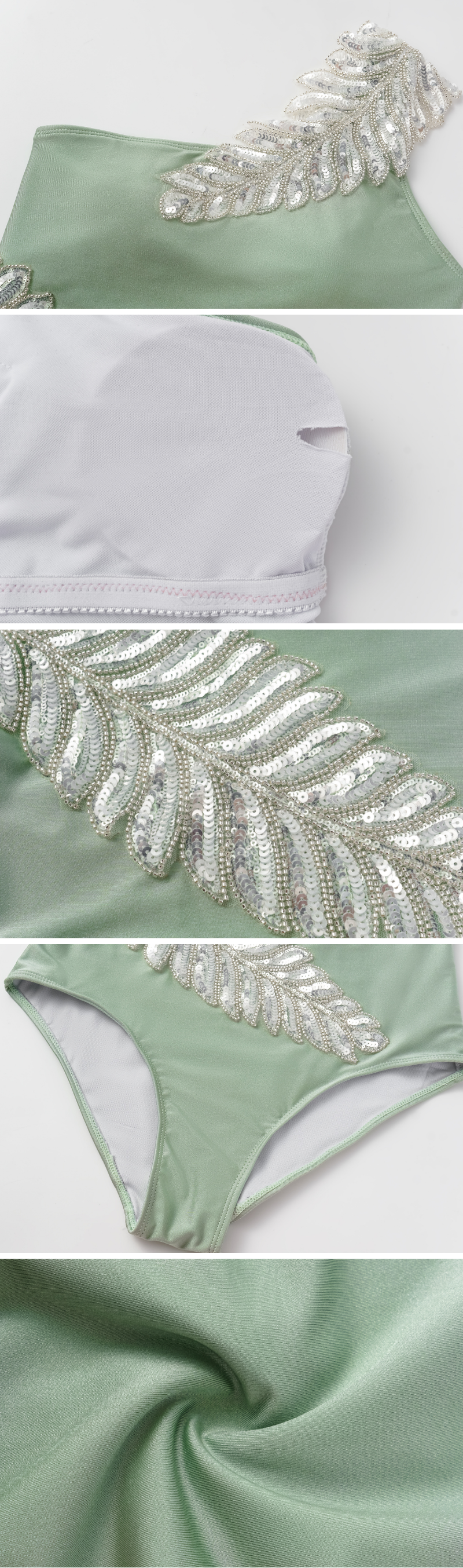 One Shoulder Sequin Leaf Embroidery One Piece Swimsuit and Sarong Flaxmaker