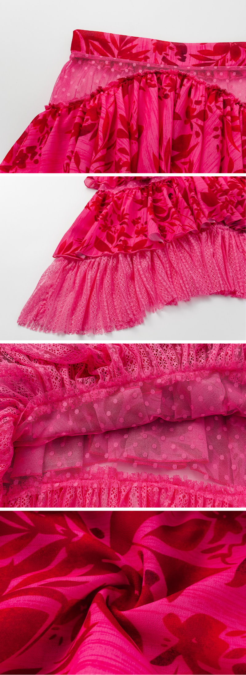 Rose Red Flower Print Net Yarn Splicing One Piece Swimsuit and Tiered Skirt