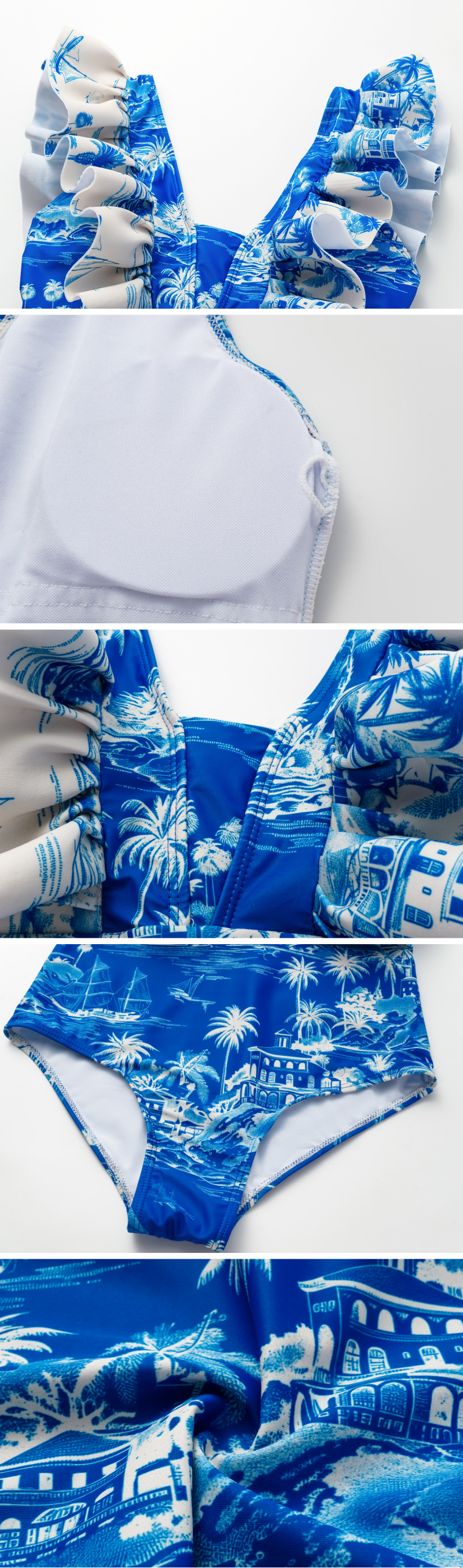 Ruffled Blue and White Bay Print One Piece Swimsuit and Skirt