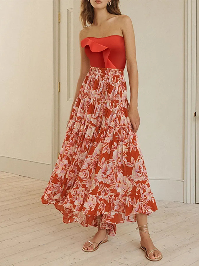 Bandeau Ruffled Orchid Print One Piece Swimsuit and Skirt
