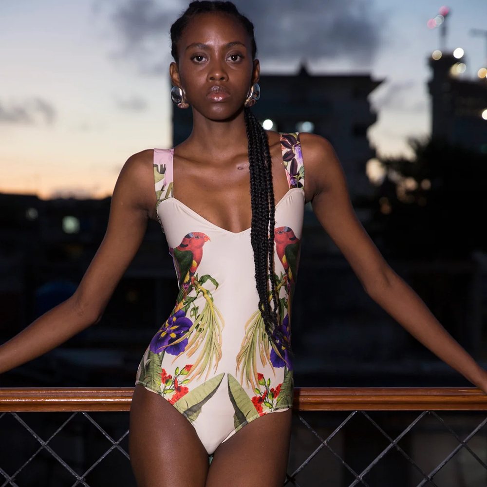 Bandeau Ruffled Orchid Print One Piece Swimsuit and Skirt