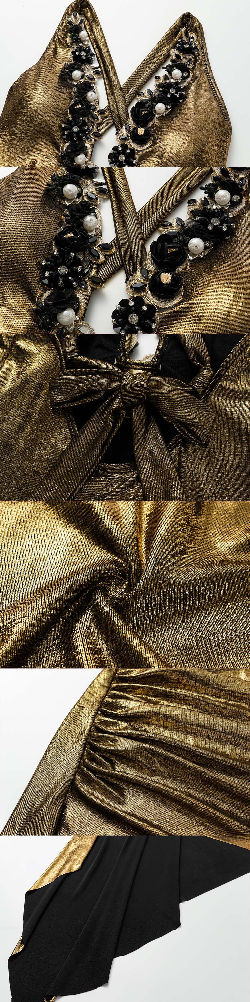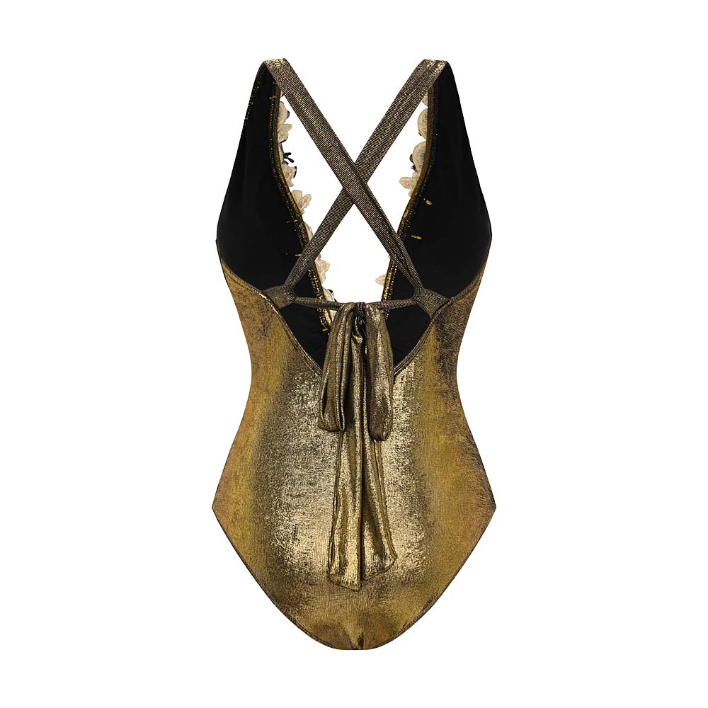 Gold Shiny Beaded Flowers Deep V-neck One Piece Swimsuit and Split Skirt
